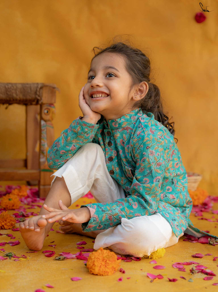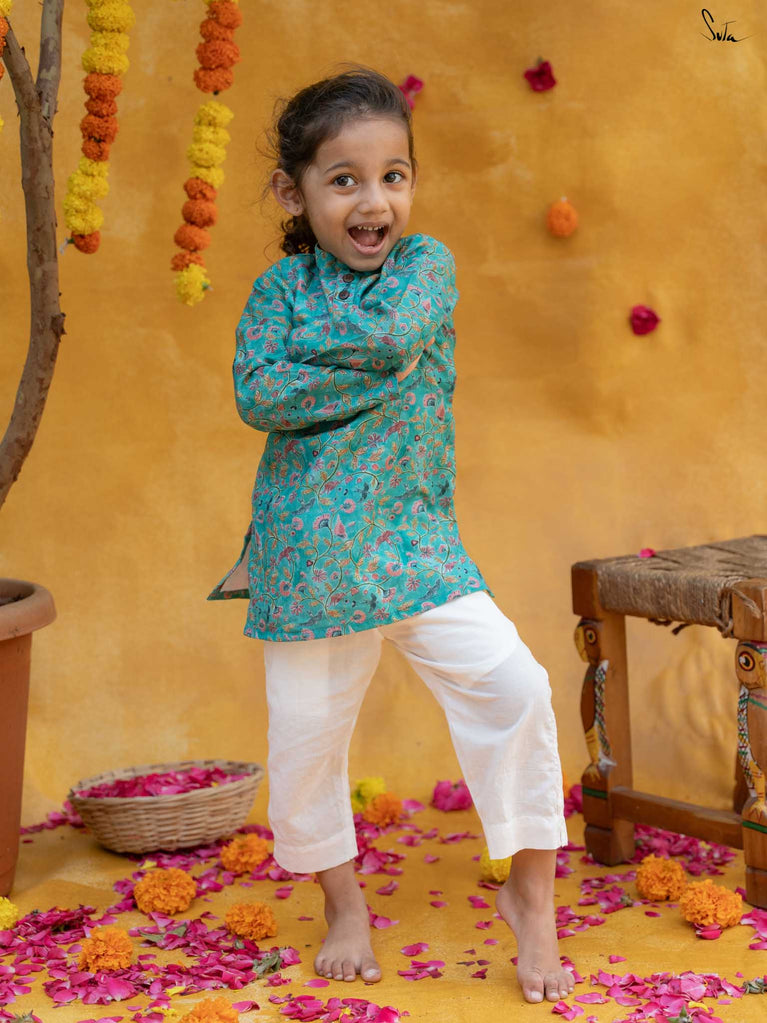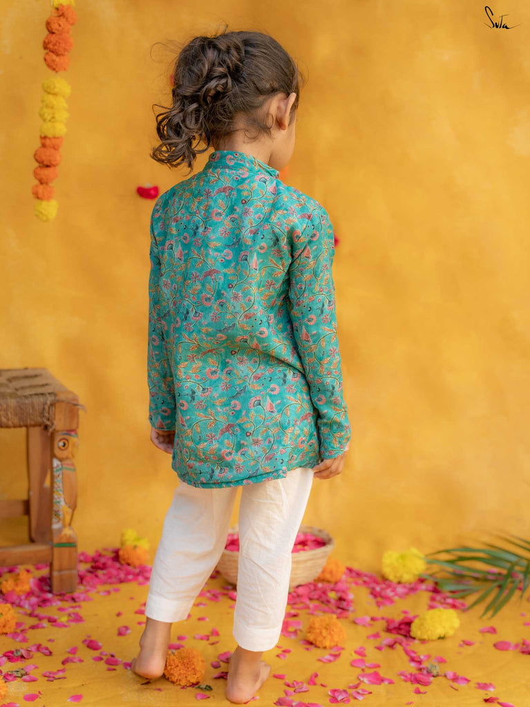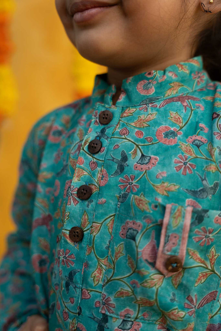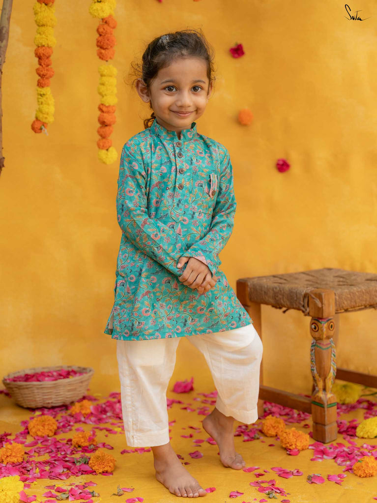 A song of colour and play, Bulbul is designed for the little gentlemen to shine. The kurta, in soft sushi voile, pairs lightness with festivity, while the cotton cambric pajama ensures all-day ease. The full-sleeve kurta features a cheerful digital print of flowers and birds, bringing a playful touch to traditional wear. A front button opening makes it easy to slip on, and side pockets add a practical twist for little treasures. The crisp white pajama pants come with an elasticated waistband and side pockets, perfect for morning aartis to evening fun.