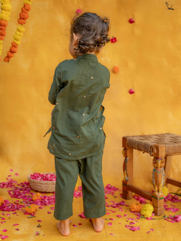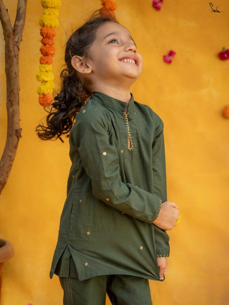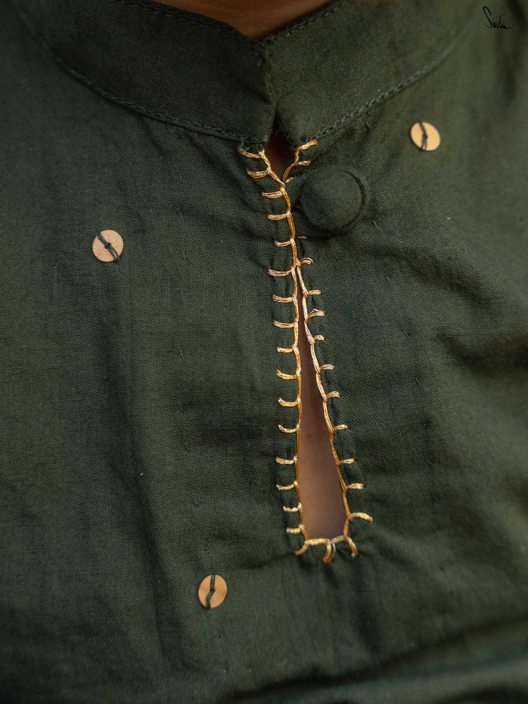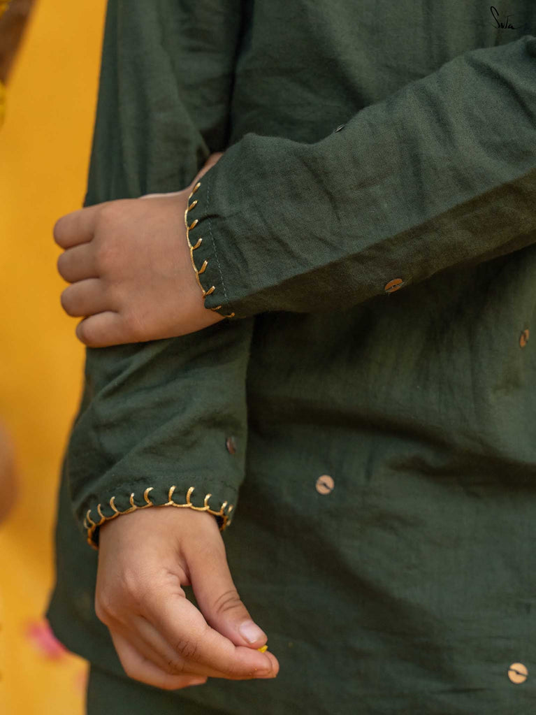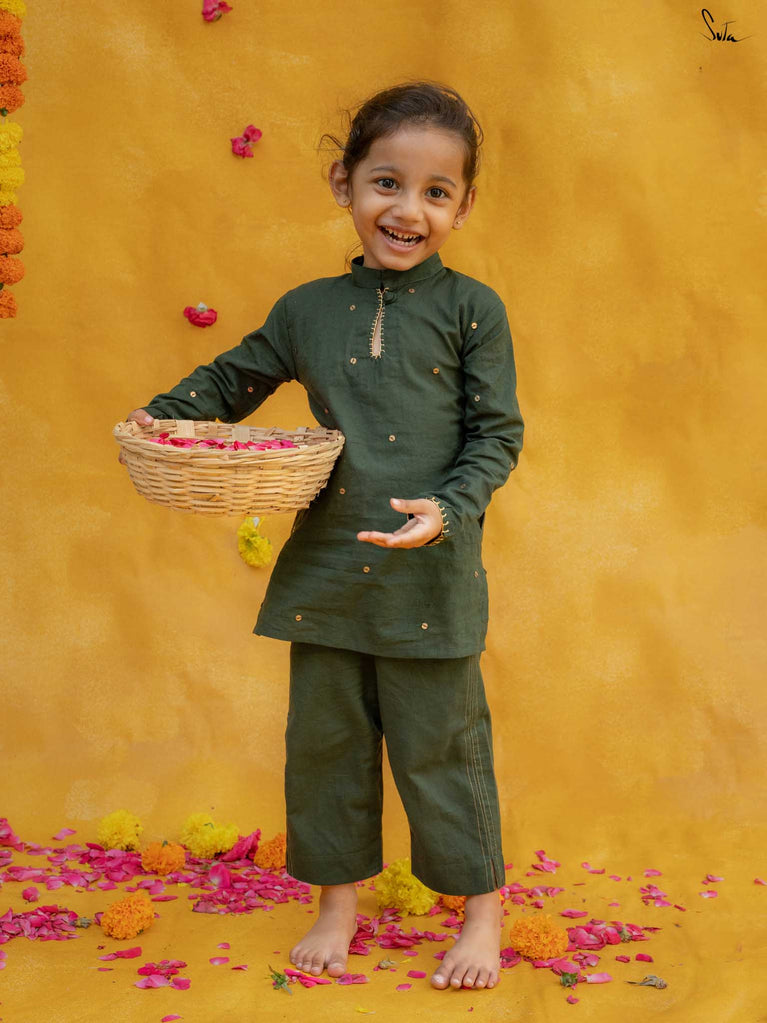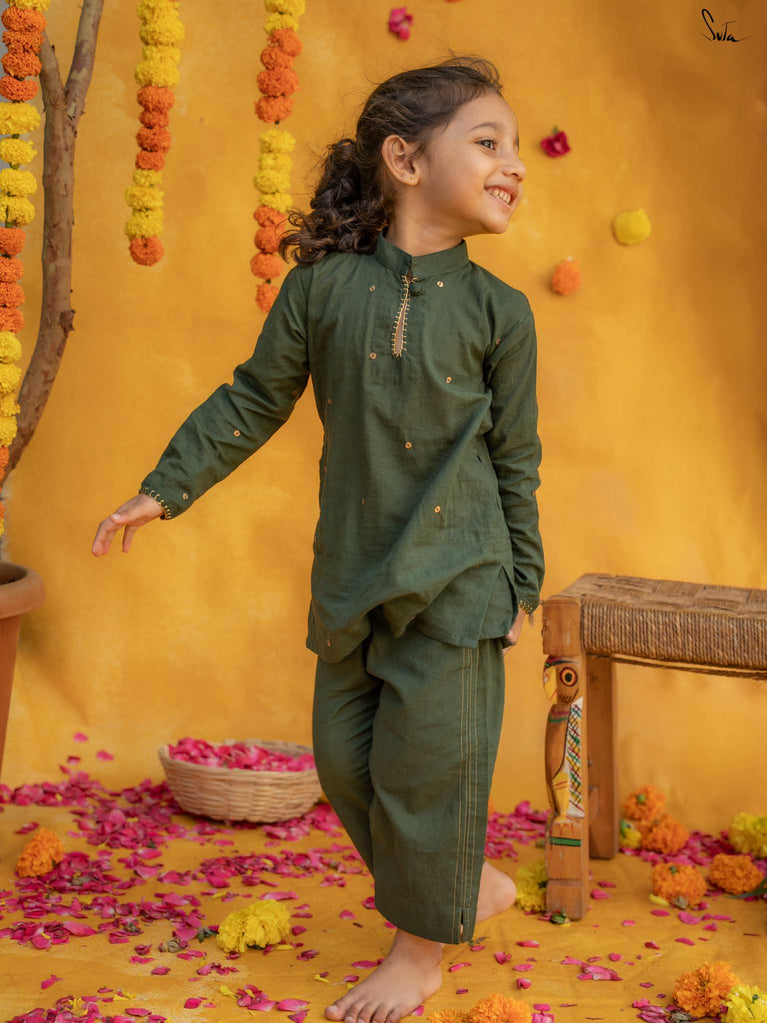 A festive classic for little gentlemen, Aamli is crafted in soft, breathable cotton cambric. The lush green, full-sleeve kurta with delicate chumki shimmer brings just the right festive magic. A front button opening makes dressing easy, and side pockets hold tiny treasures. The matching pajama pants feature cotton cambric comfort, an elasticated waistband, and side pockets for all-day ease, perfect for pujas, family gatherings, or joyful play.