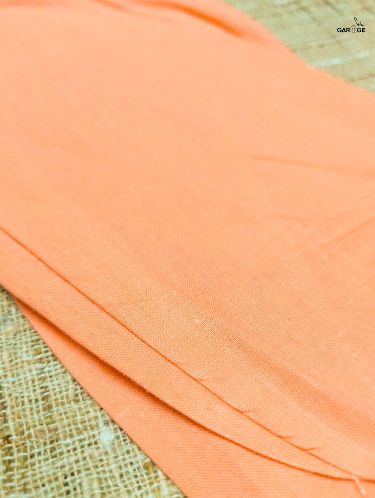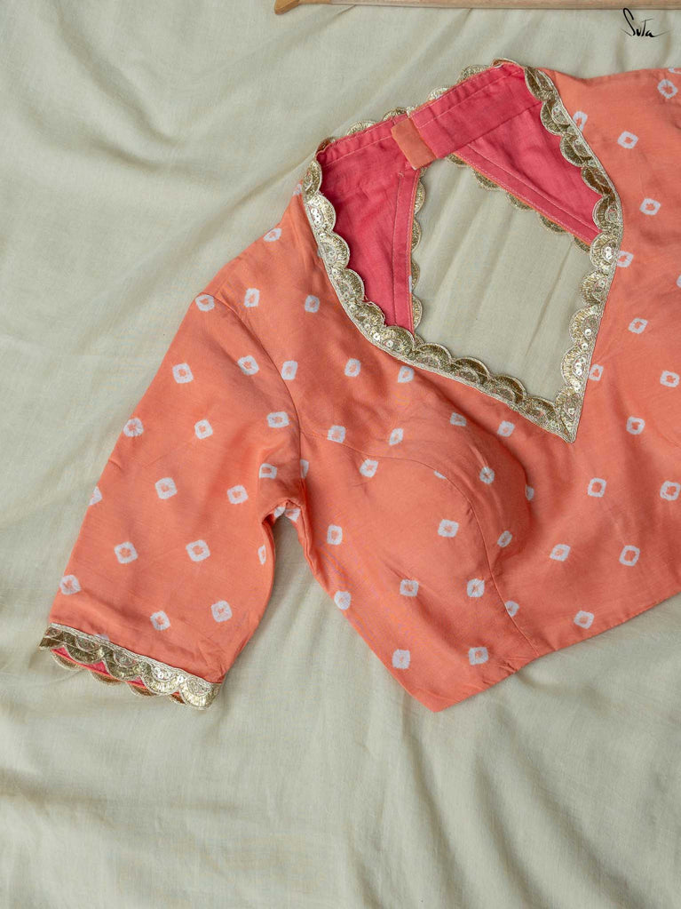 Blush is a sophisticated Orange blouse from the Rangrez collection, crafted to blend heritage artistry with modern elegance. Made in soft cotton muslin, it features traditional Bandhani tie-dye patterns and 1/4th sleeves with a classic collar neck. The gold lace detailing on the sleeves and neckline adds a subtle festive shimmer, making Blush a perfect companion for Rangrez sarees or as a standalone statement for celebrations.