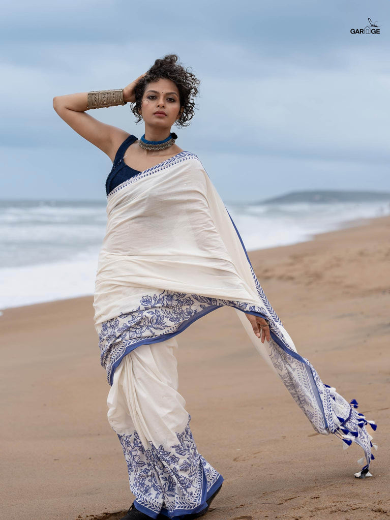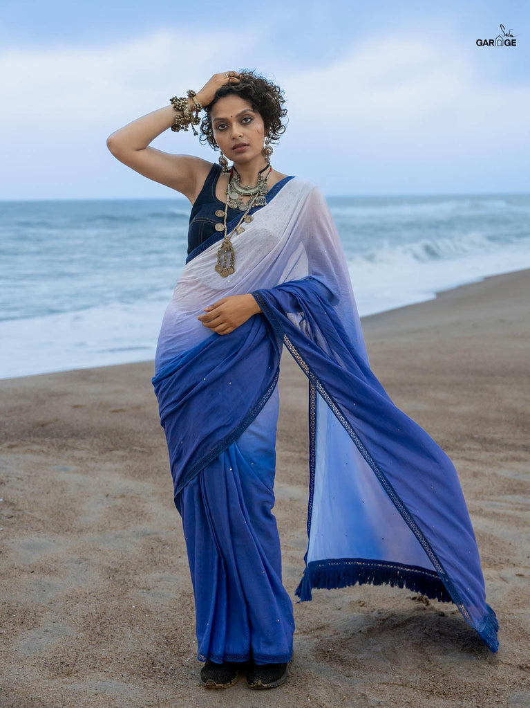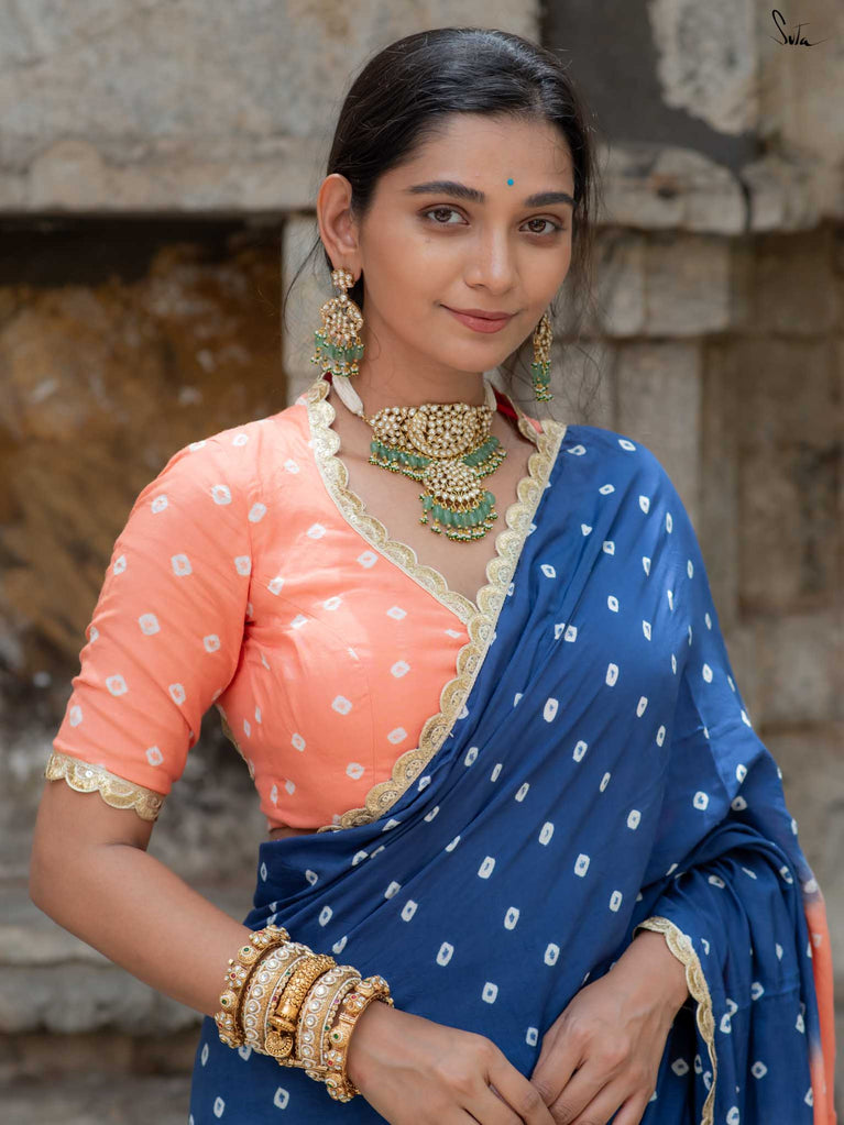 The model is wearing size S blouse and the saree is Ocean sa Bandhej