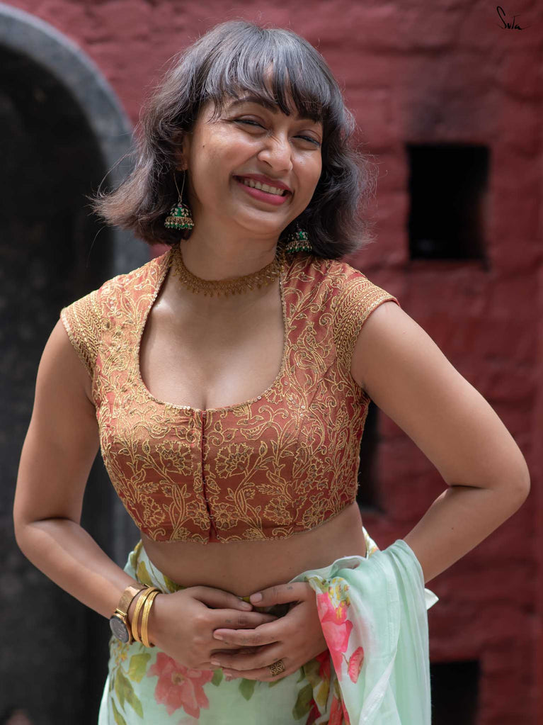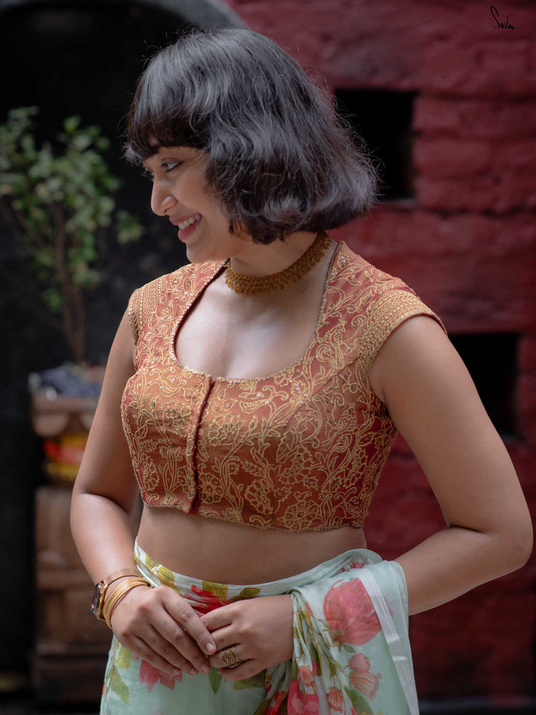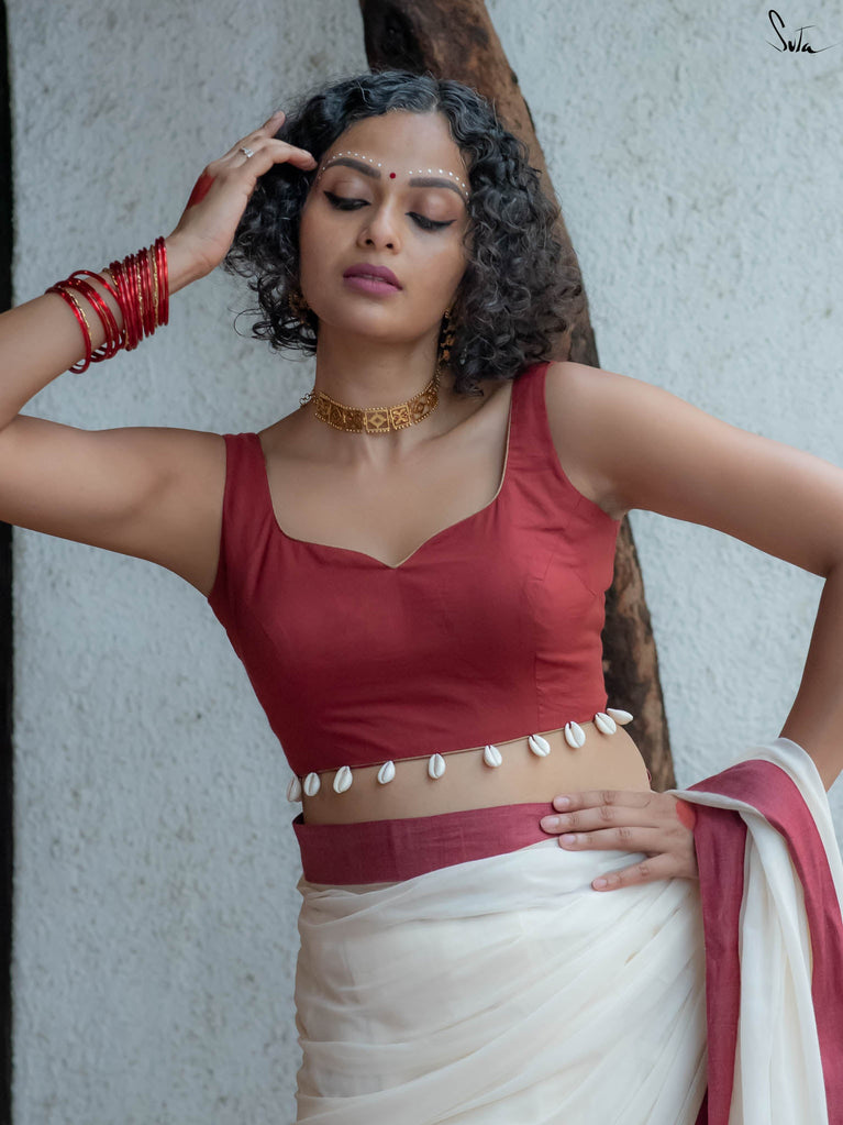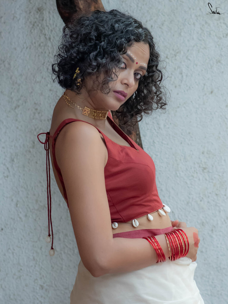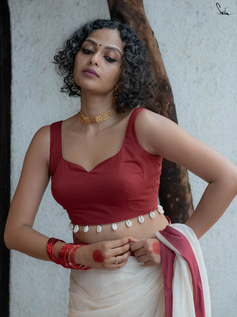 Designed with Pujo days in mind, this maroon cotton blouse with a refined dome neckline and sleeveless cut is all about keeping you chic and comfortable. The breathable cotton keeps you cool when the pandal crowds get overwhelming. It’s the kind of blouse that lets you move, laugh, eat, dance, and join the adda without a second thought. Pair it with your favourite saree and you’re set for long, joy-filled Pujo days—no fuss, just full carefree abandon.
