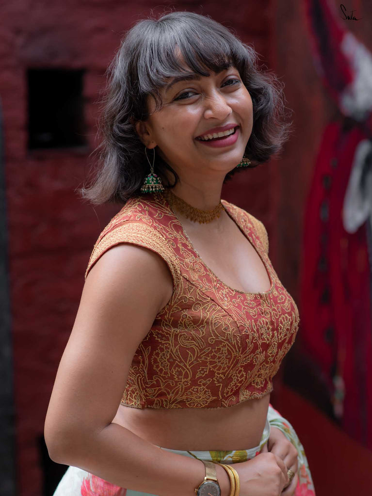 Su, the model is wearing size S blouse and the saree is Flying to the Moon Polka.