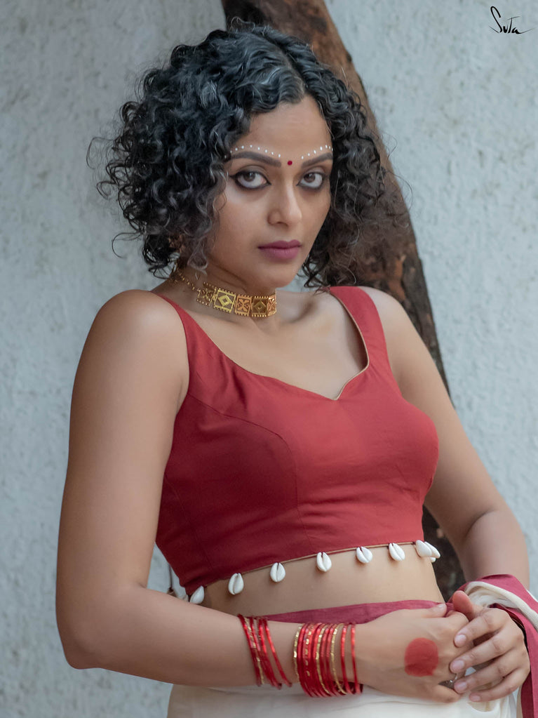 Blouse: The model is wearing XS size blouse called Basic Laal