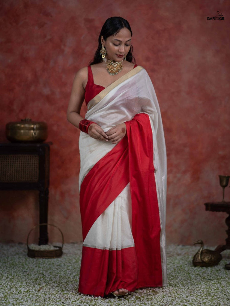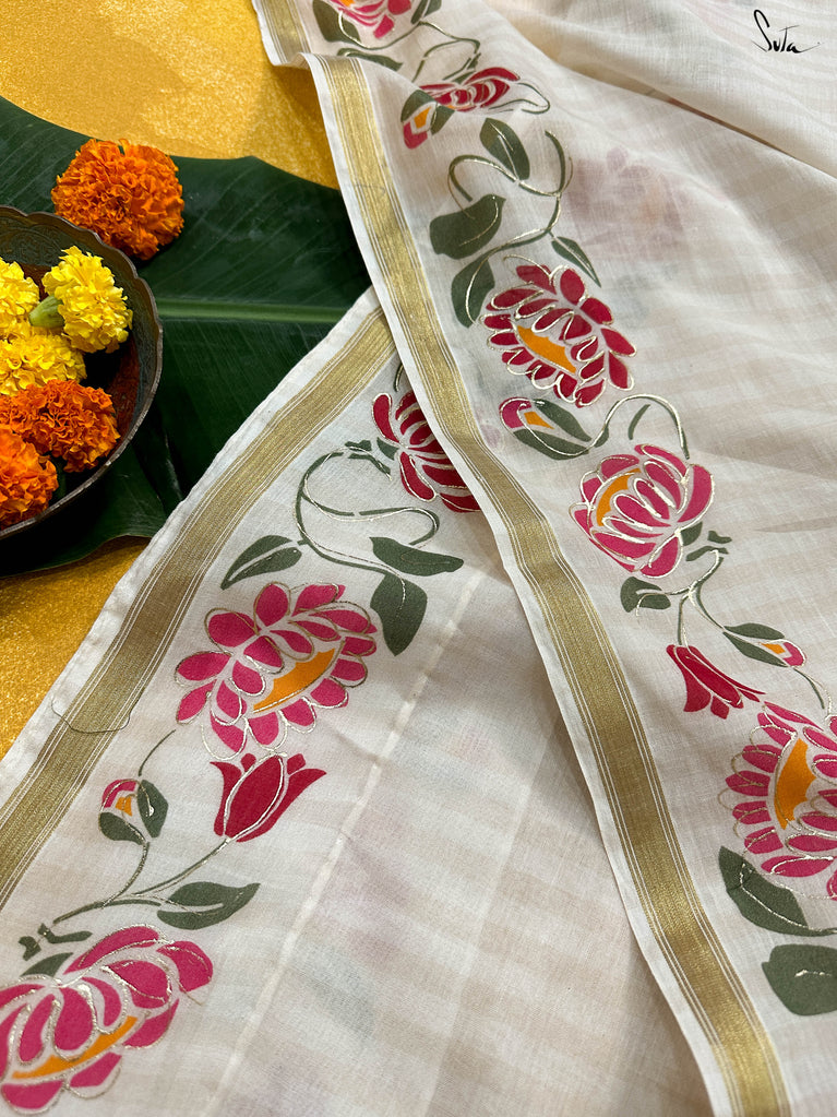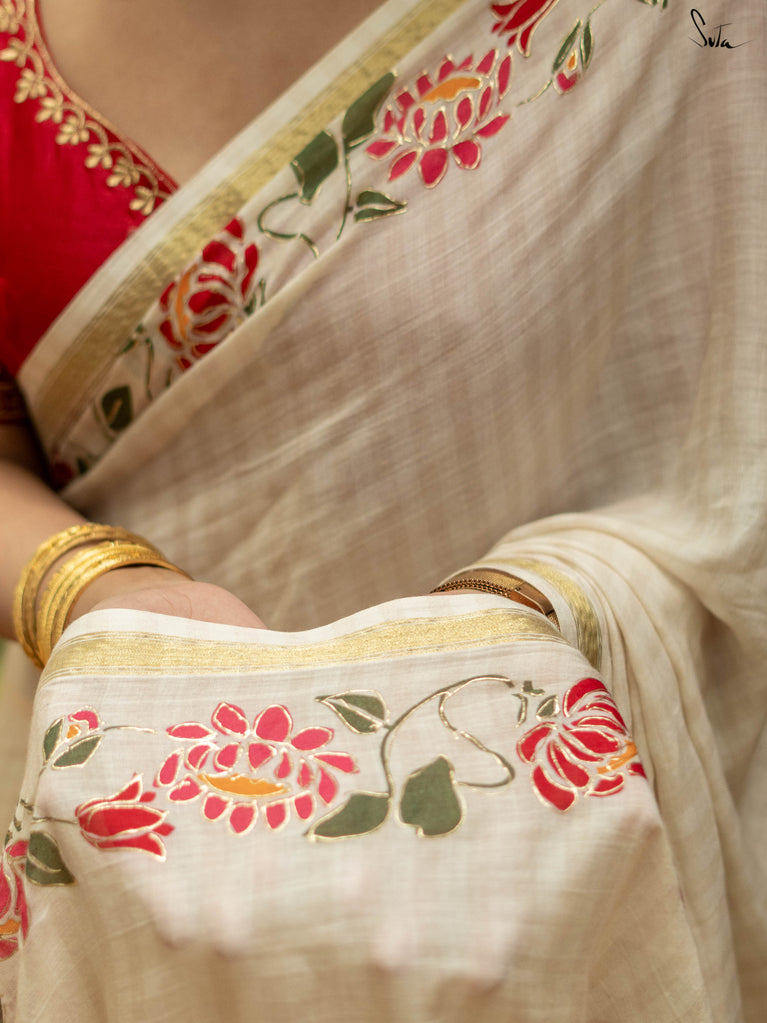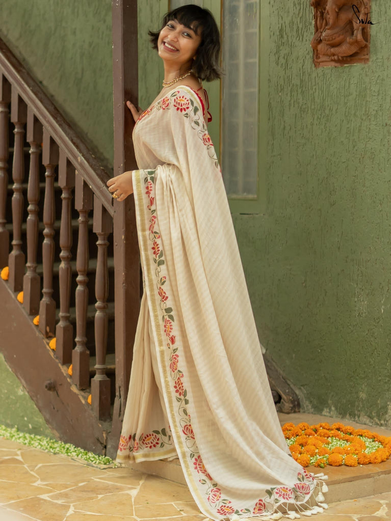 Arali is crafted from a cotton viscose blend, embodying the essence of a flower garden. This off-white saree drapes beautifully and a classic gold zari border adds a touch of regal opulence.
