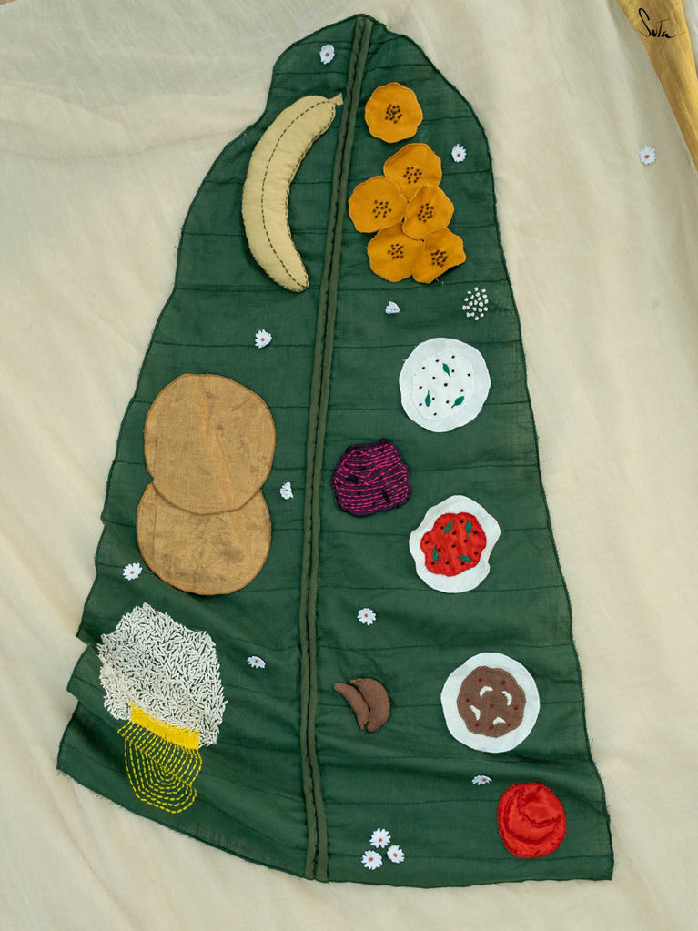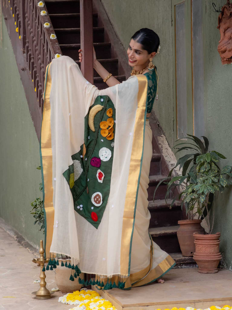 Asadhyam! is a woven mul cotton saree in a classic off-white shade, finished with a rich gold zari border. The highlight is the pallu, featuring a colourful patchwork of the iconic Onam Sadhya served on a banana leaf. Small white floral motifs are scattered across the body, adding a soft, charming touch to this joyful drape. The name Asadhyam! is a familiar Malayali expression usually said with a smile and a happy sigh after a delicious meal. This saree brings that same feeling to life: of fullness, joy, and celebrating the little things that matter.