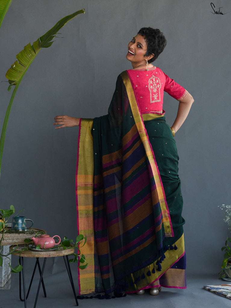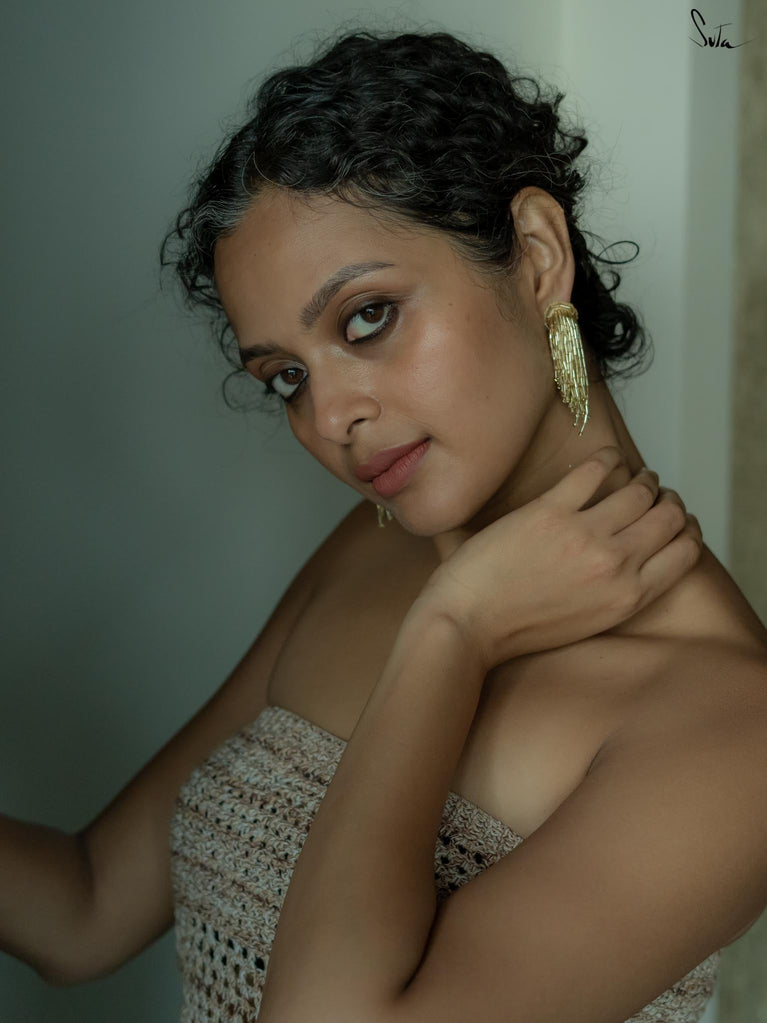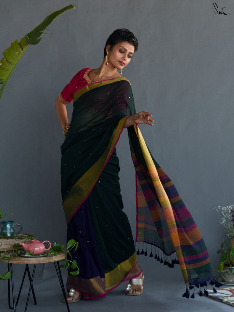 Su, the model is wearing size S blouse and the saree is Floating Stars in the Galaxy Polka.