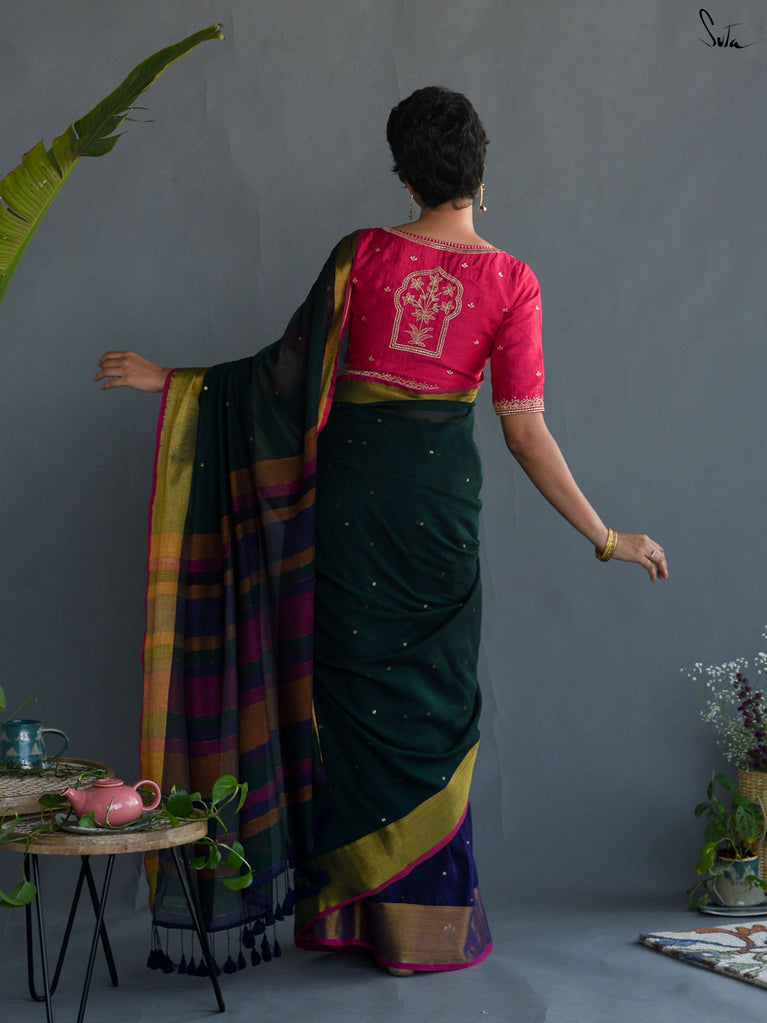 Su, the model is wearing size S blouse and the saree is Fireflies in the Garden Polka.