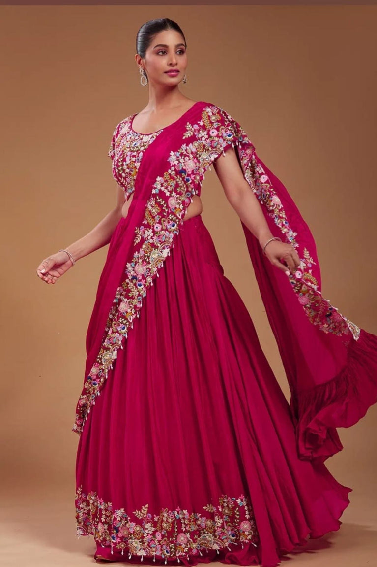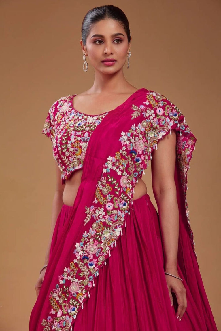 Step into style with Embroidered Elegance, a pink lehenga made from soft georgette and detailed with stunning multicolor embroidery. This outfit is a perfect choice for weddings, festive events, or any special day.
