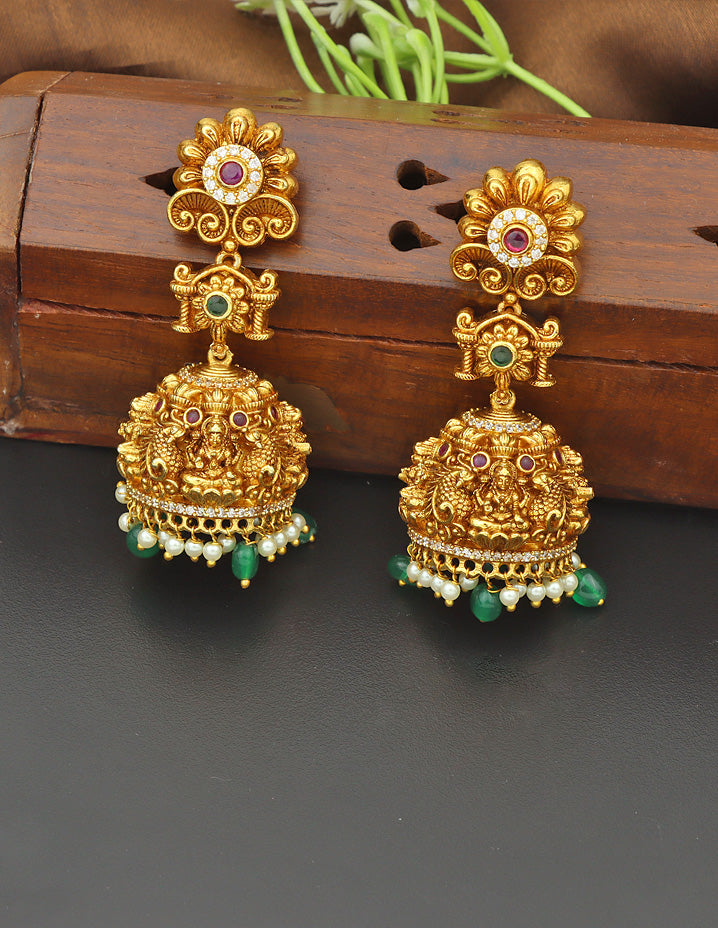 This Matt Kempu Lakshmi Devi Long Haram Set, adorned with Rani Pink & Emerald stones and gold beads, adds a touch of traditional elegance.With matching earrings, it’s the perfect statement piece for any occasion, making a bold, eye-catching impact.