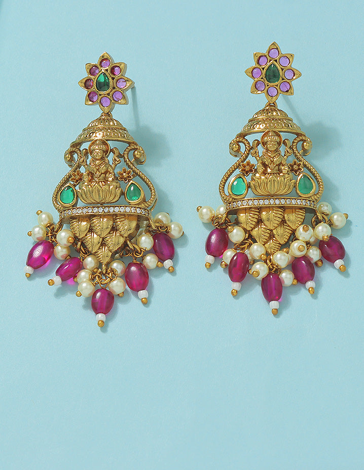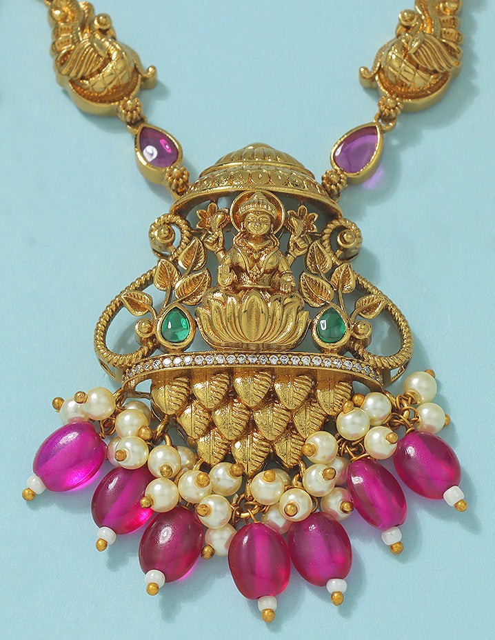 A majestic gold-plated necklace set adorned with vibrant magenta beads, emerald and ruby accents, and intricate temple motifs. The divine Lakshmi design and rich detailing exude traditional charm, perfect for bridal and festive elegance.