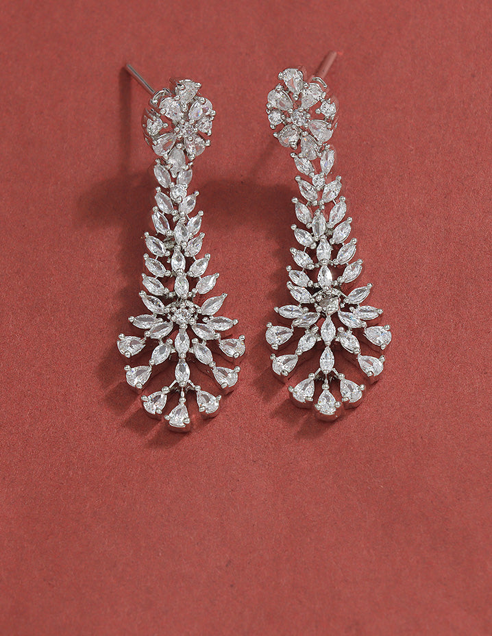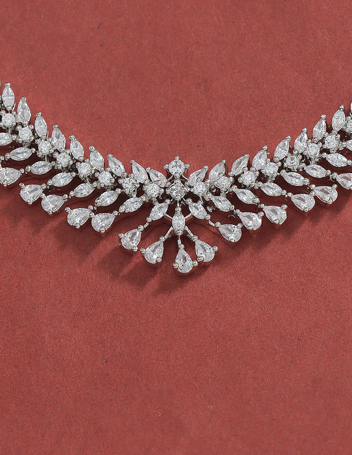 A radiant Rhodium-toned necklace and earring set adorned with sparkling Bud and floral motifs, perfectly blending elegance and charm for your special occasions.
