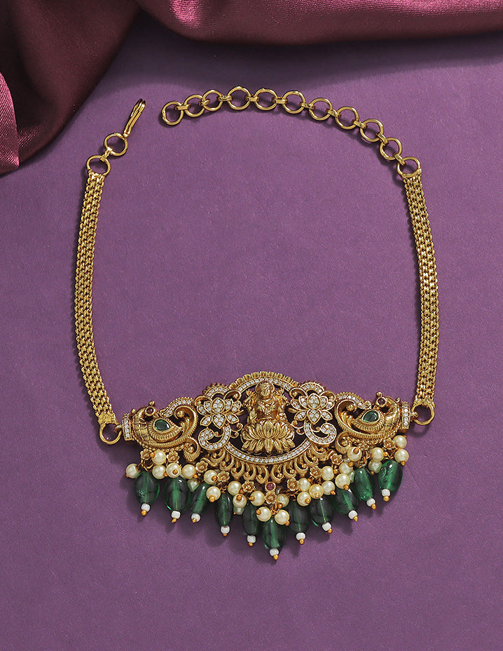 Radiate traditional charm with this antique gold-finish Bajuband, adorned with floral motifs, a striking stone centerpiece, green accents, and elegant with pearl drops—perfect for festive and bridal wear.