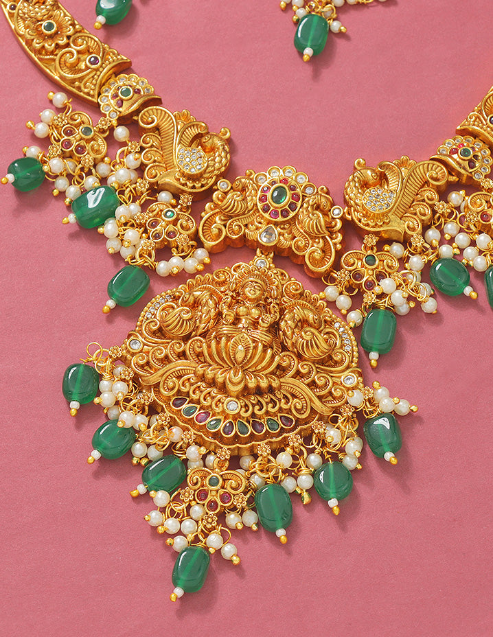 The Designer Lakshmi Devi Necklace Set features beautiful green beads and a detailed peacock design. This elegant set adds a traditional touch to any outfit, perfect for special occasions.