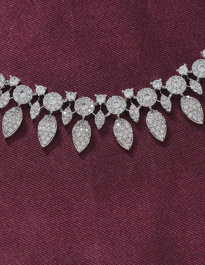 This Designer Zirconia Elegance Necklace Set features sparkling white stones enhanced by a durable rhodium polish. Its refined craftsmanship adds a sophisticated glow to any ensemble.