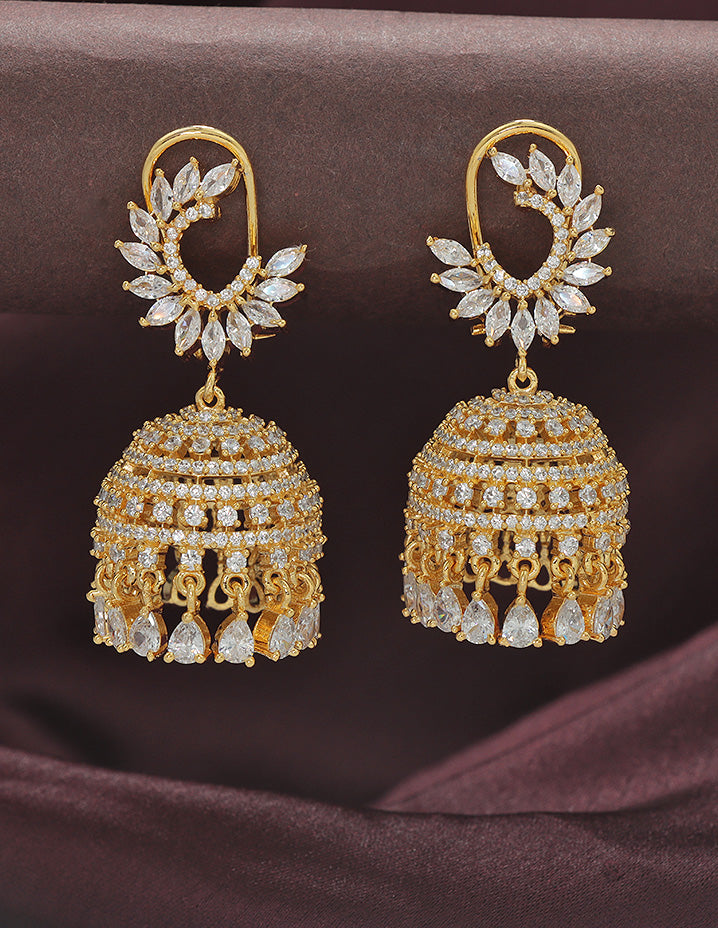 Designer earrings are classic jhumka-style danglers with a fusion of traditional and contemporary design. The bell-shaped drop is richly embellished with white stones and tear-drop dangles, paired with a sparkling oval top.