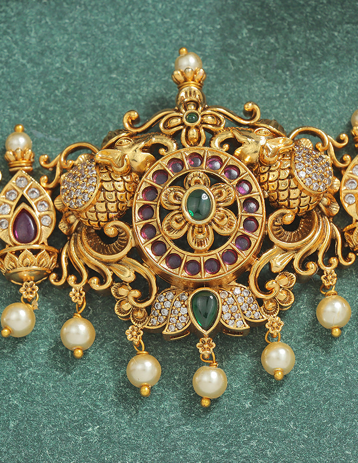 This Matt Chain Vaddanam has a chic and ethnic design. Adorned with CZ Stones, Pearls and green Beads attached as a Hanging to look Beautiful , it can be styled with various outfits, including indo-western ones.