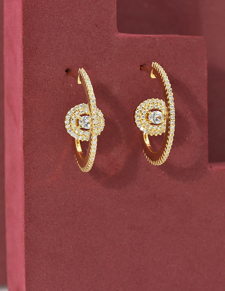 Designer earrings have a graceful and modern design with a central floral motif encrusted with cubic zirconia, surrounded by a curved, oval-shaped golden loop also studded with stones. The intricate detailing gives them a very luxurious and festive appeal.