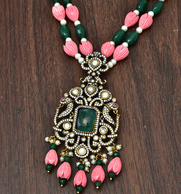 Add timeless elegance to your look with this Victorian Tulips Pendant, featuring emerald beads and green-white stones in a rich Victorian polish. A must-have statement piece for any special occasion!