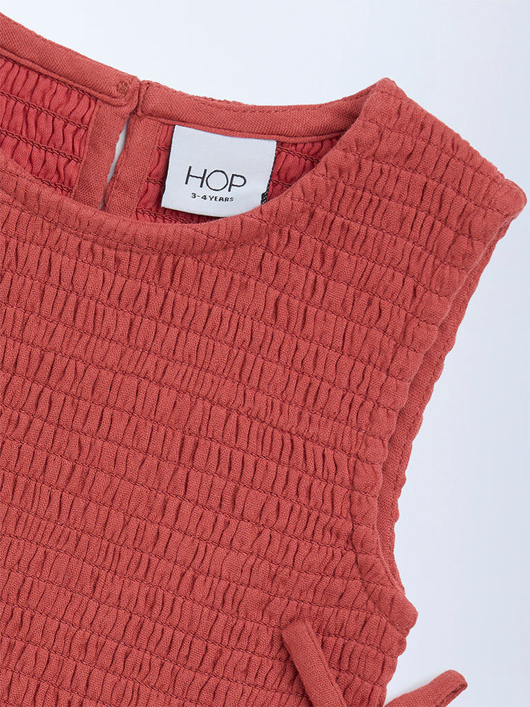 Designed for easy everyday styling, this rust top from HOP Kids features a smocked bodice for a comfortable, flexible fit. Made from pure cotton, it’s finished with a round neckline, sleeveless cut and a cute bow detail at the front.