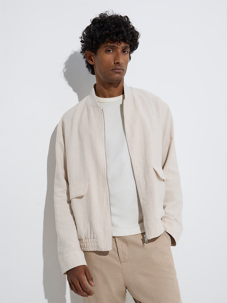 Cut in a relaxed silhouette, this beige bomber jacket from Ascot is made from a linen-blend fabric for a lightweight feel. Designed with a mock collar, full sleeves, and a zipper placket, it’s the perfect layer for transitional weather. Two flap pockets add a functional touch to this stylish piece.