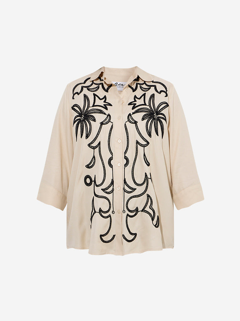 This beige shirt from Gia boasts intricate embroidery at the front for a distinctive charm. Fashioned with a collar that extends to a button placket and three-quarter sleeves, this lightweight garment offers effortless elegance.