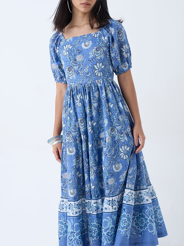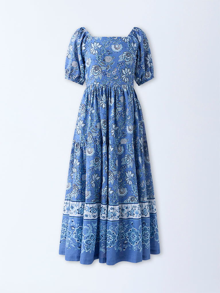 This blue dress from Bombay Paisley captures effortless elegance. Tailored in pure cotton and patterned with graceful florals, it features a square neck, puff sleeves, and a smocked back that ensures a flattering fit. The A-line silhouette flows with ease, making it an effortless choice for sunlit strolls or laid-back festive days.