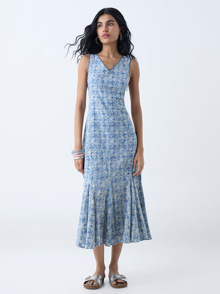 Step into sophisticated ease with this blue dress by Bombay Paisley. Tailored from pure cotton, it showcases beautiful floral motifs on a flowing A-line silhouette. The sleeveless cut is balanced by a V-neckline, while ruffle detailing at the hem adds a feminine finish.