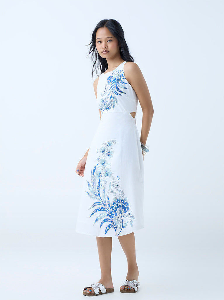 This white sheath dress from Bombay Paisley blooms with vibrant floral prints. Spun from a soft cotton-blend fabric, the fitted silhouette is styled with a round neck and further accentuated with cut-out detailing at the waist for a stylish look.