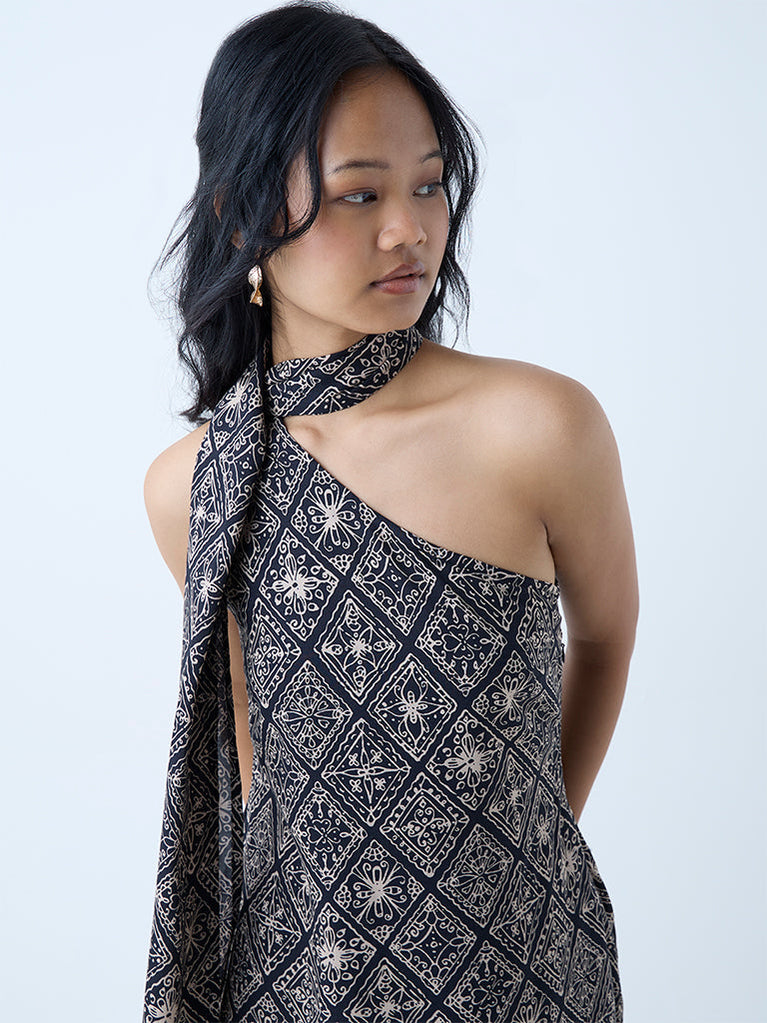 This black dress from Bombay Paisley makes a confident statement with its one-shoulder neckline, enhanced by a chic tie-up detail for added flair. Spun from a lightweight fabric, it’s brought to life with eye-catching prints that channel contemporary charm. The flowy silhouette is balanced by a concealed side zipper for a seamless finish.