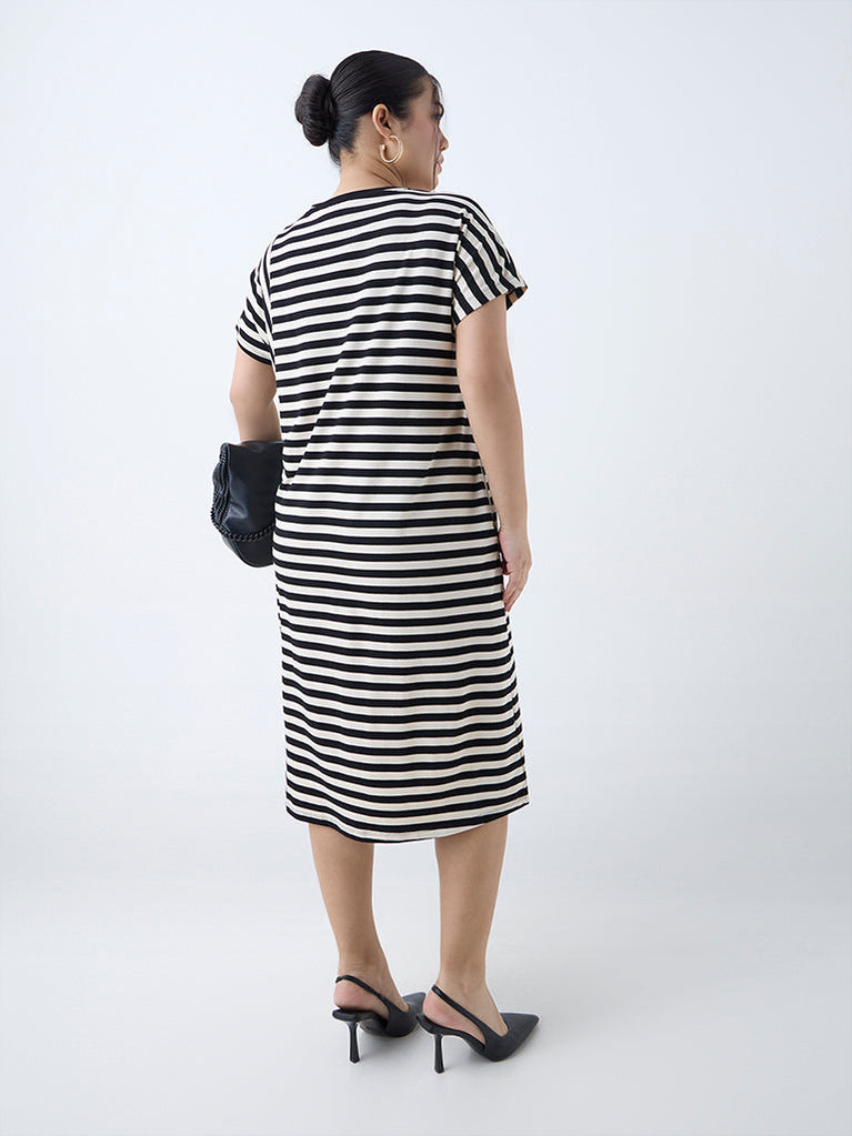This black dress from Gia is defined by striped prints that add depth to its minimalist design. Featuring a round neck, relaxed dolman sleeves and a pocket, it blends effortless style with everyday functionality.
