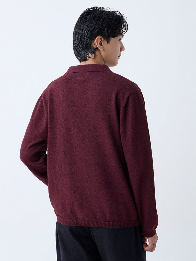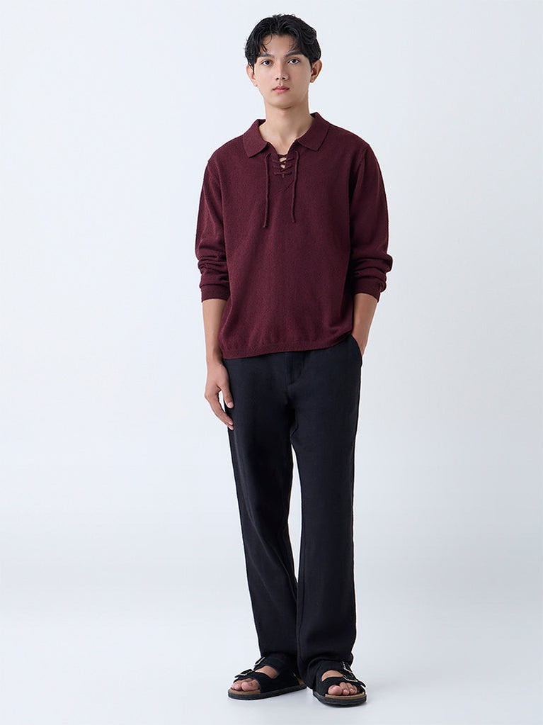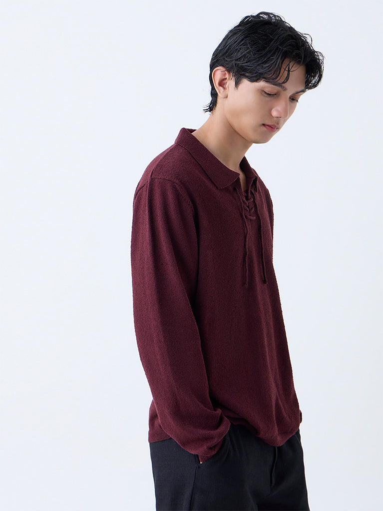 Elevate your winter style with this maroon knit sweater from ETA. Featuring a spread collar with criss-cross drawstrings, it blends comfort with casual sophistication. Finished with ribbed hems and a soft texture, it’s the perfect choice for stylish everyday dressing.