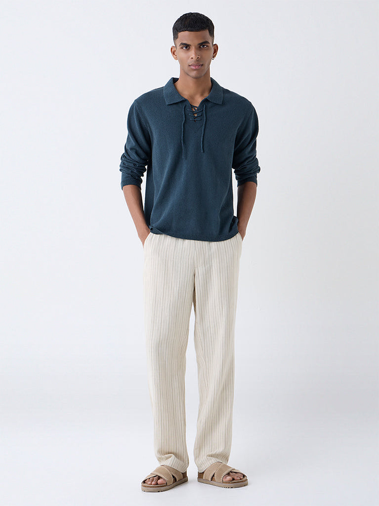 Amplify casual dressing with this dark blue sweater from ETA, crafted in a soft cotton-blend that delivers all-day comfort. The relaxed silhouette is balanced with a classic collar, while the criss-cross detailing at the front introduces subtle structure and visual interest. Finished with full sleeves and ribbed cuffs, it is an adaptable winter layer that pairs effortlessly with everything from denims to tailored joggers.