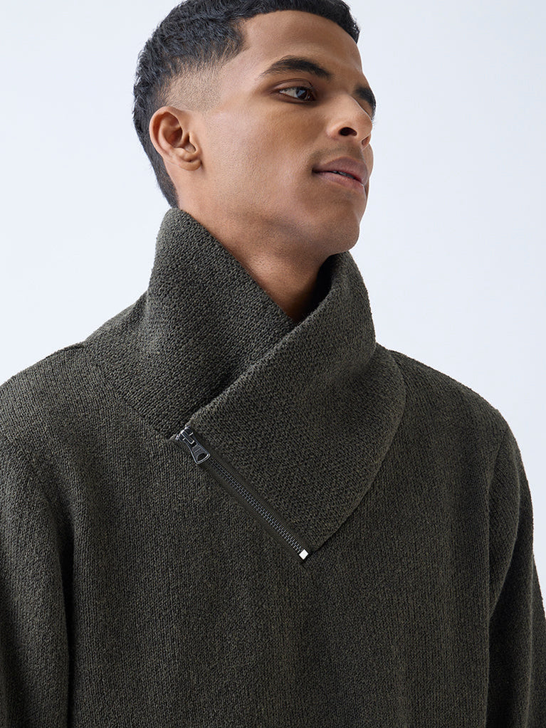 This olive ETA sweater brings textural warmth to colder days. Made from a sumptuous fabric blend, the relaxed fit offers steady comfort without feeling heavy. The shawl collar is finished with an asymmetric zip that adds visual interest, while ribbed trims shape the edges for a neat, grounded finish.
