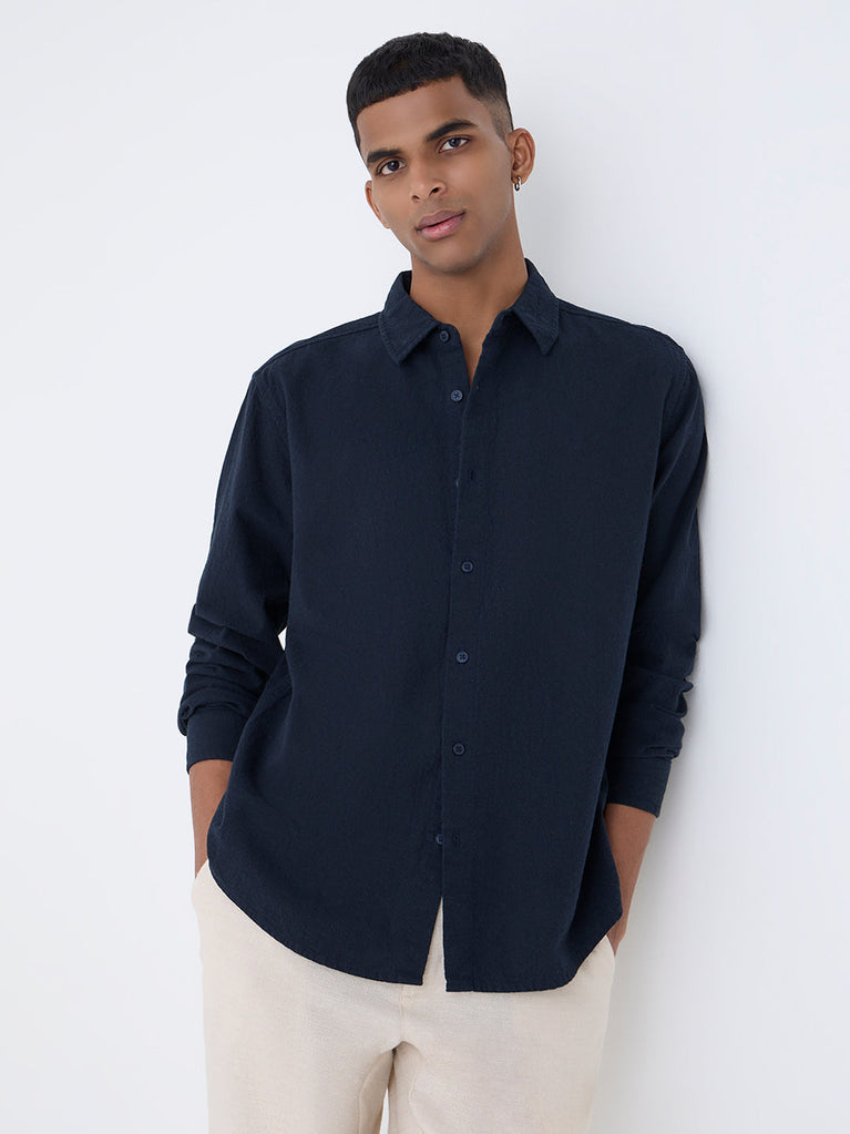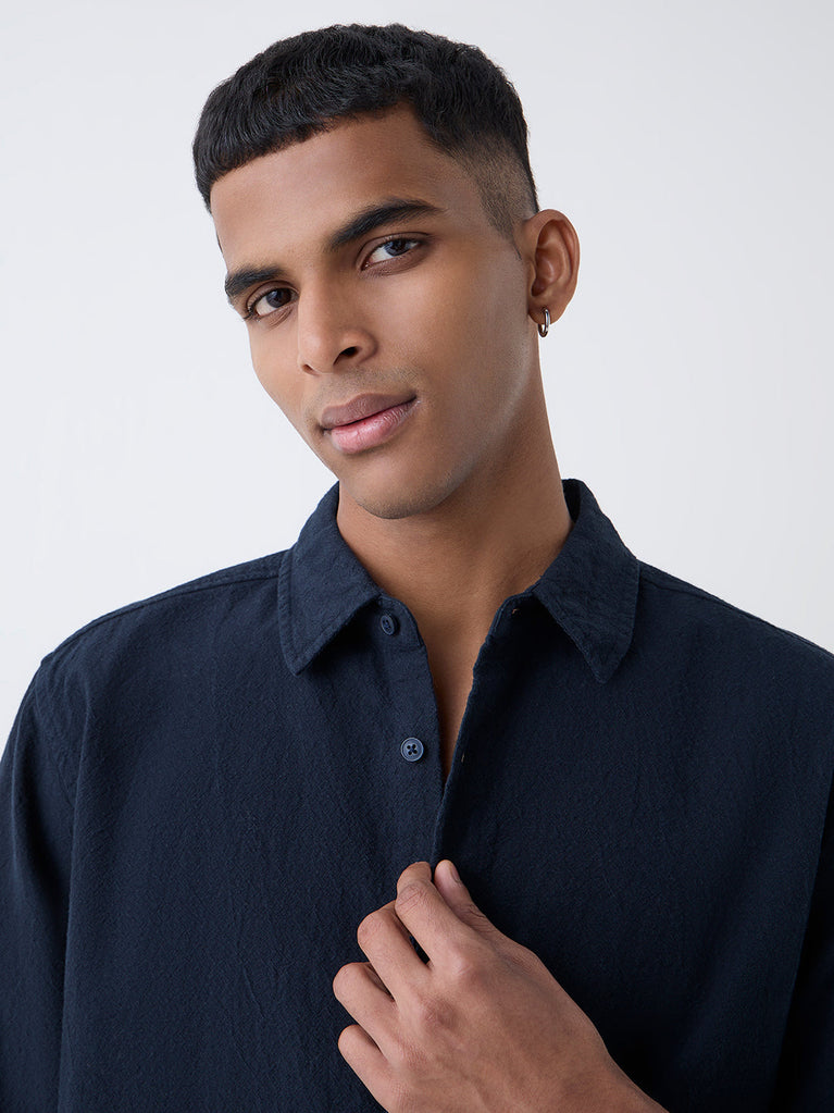 ETA Navy Solid Relaxed-Fit Cotton Shirt