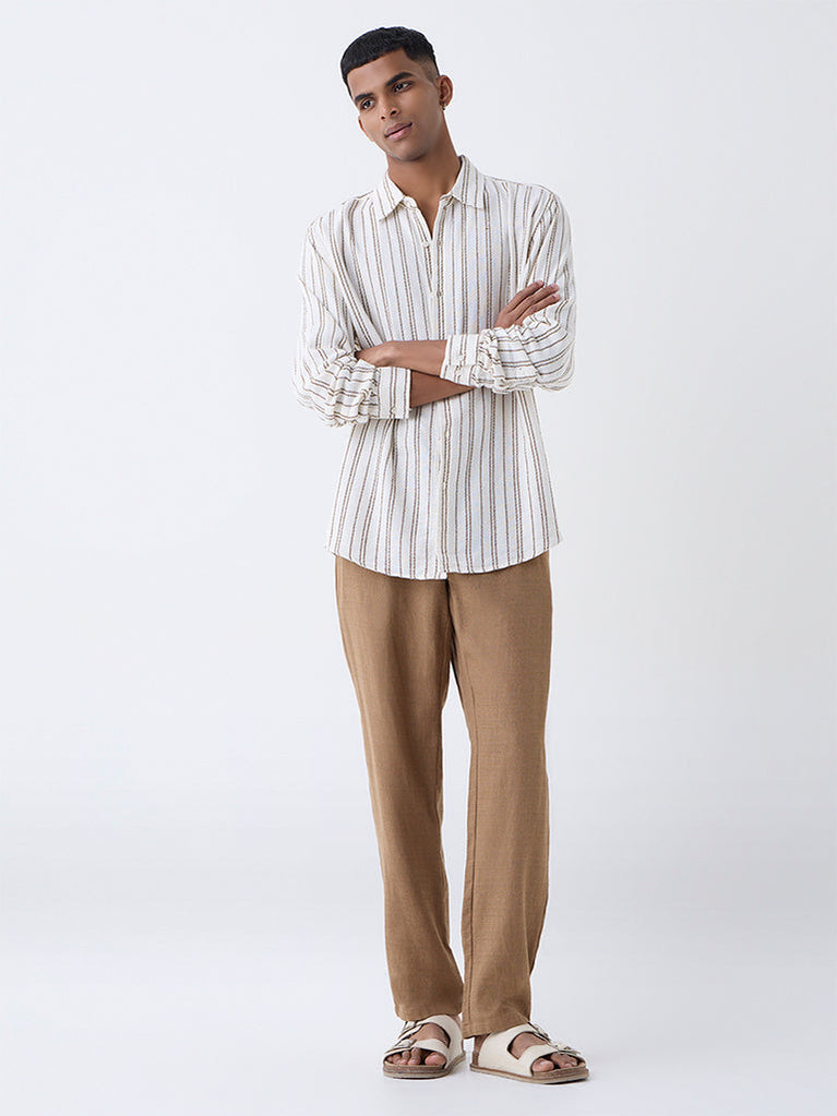 ETA introduces a clean, versatile essential with this off-white shirt, defined by embroidered stripes that add quiet structure to the relaxed silhouette. Cut from a breathable woven fabric, it keeps you comfortable from morning commutes to evening downtime. Finished with a classic collar, full sleeves and a buttoned front, it adapts easily to smart-casual plans or polished weekend dressing.