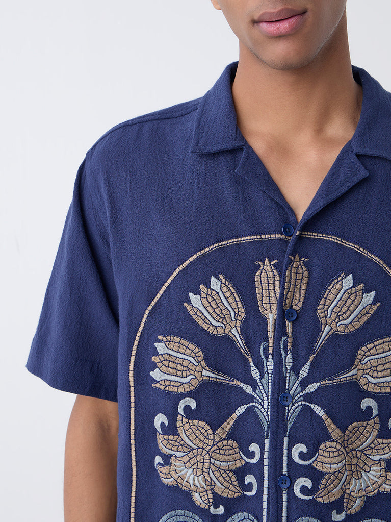 ETA Navy Floral Embroidered Relaxed-Fit Cotton Shirt