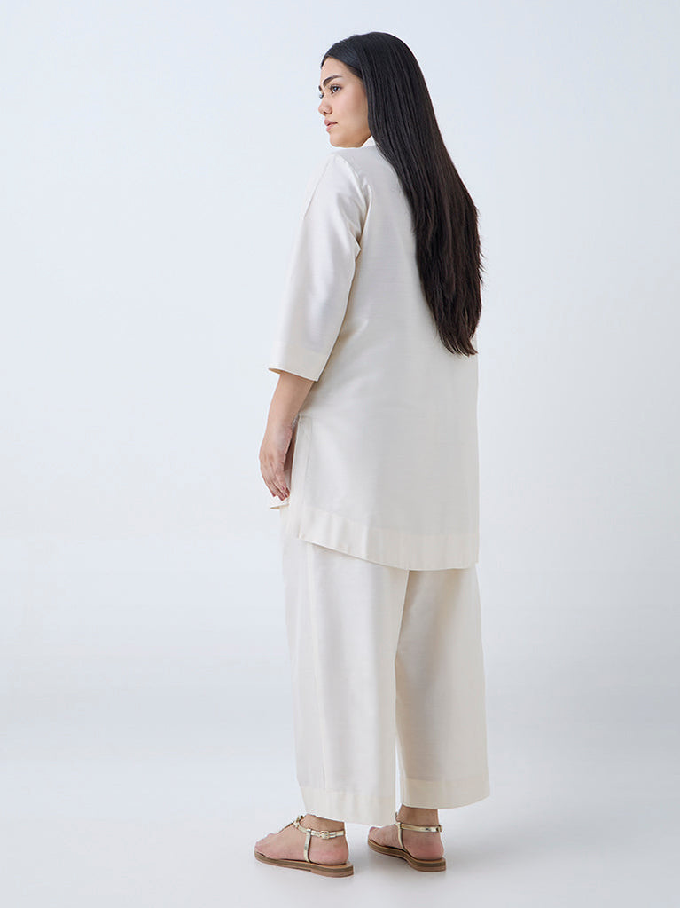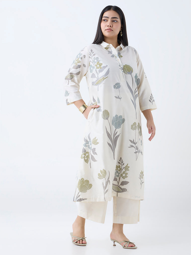 This off-white kurta from Diza is adorned with graceful floral motifs for feminine appeal. Carved in a straight silhouette, it features a smart collar with a brief button placket, three-quarter sleeves, and a slip pocket for everyday ease.