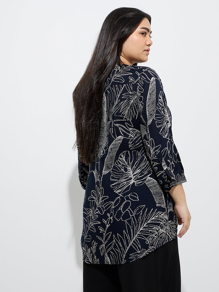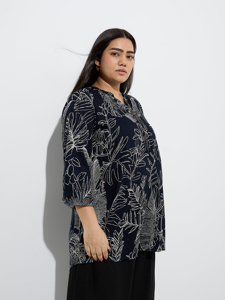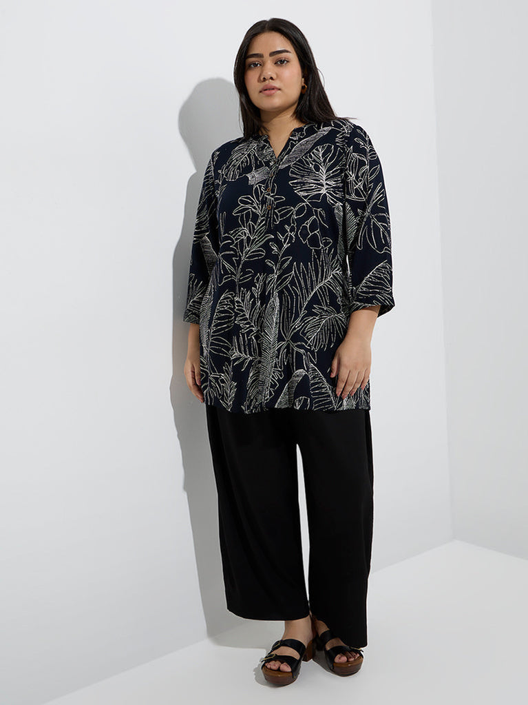 This elegant black tunic from Diza flaunts intricate foliage-inspired prints, adding a touch of nature to its modern design. Crafted from a breathable fabric, it offers both comfort and style. The mandarin neck leads into a quarter-button placket, while the three-quarter sleeves provide a perfect balance of coverage and ease.
