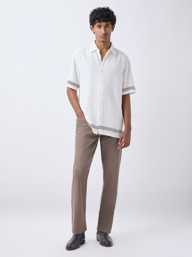 Ascot presents these white jeans in a relaxed cut, offering both comfort and style. Crafted from soft, breathable fabric, this mid-rise bottom wear features a smooth buttoned waistband, belt loops, a zipper fly, and multiple pockets for practical flair.