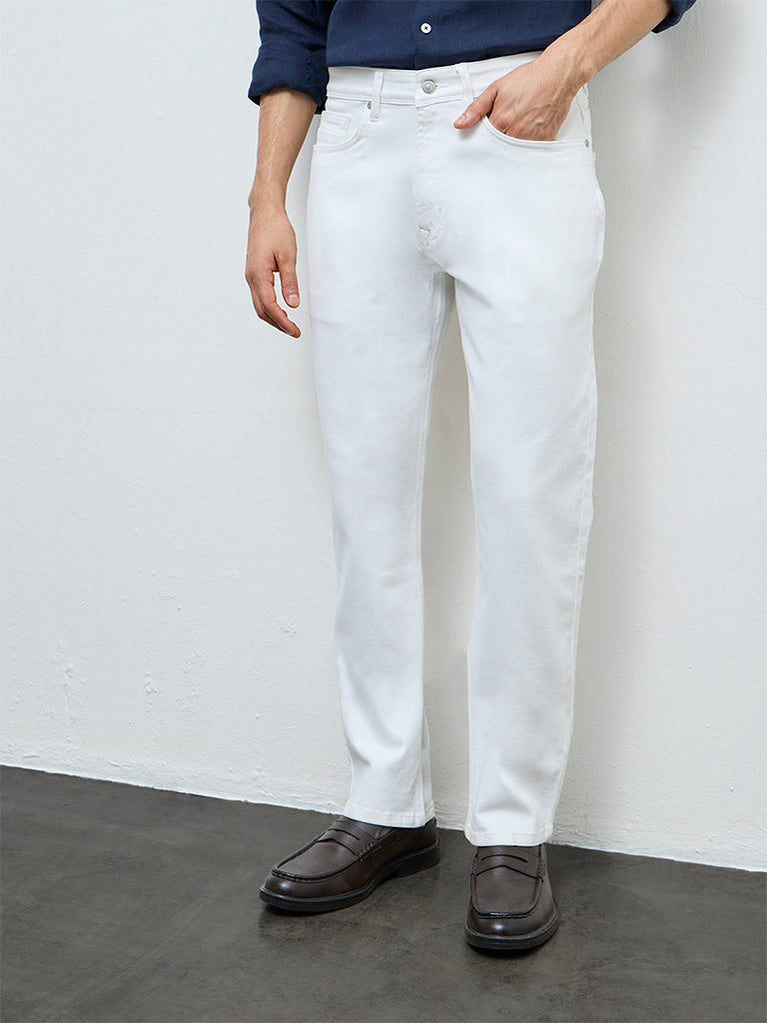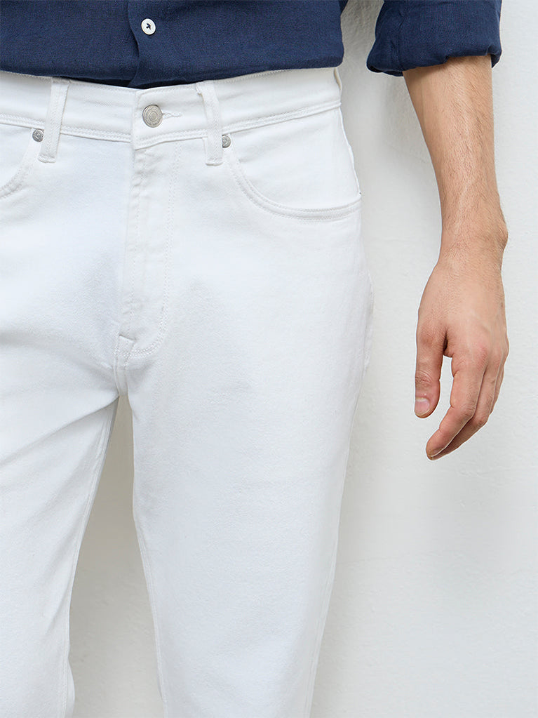 Casual styling stays effortless with these white jeans from Ascot, cut in a relaxed fit with a mid-rise profile. Detailed with a buttoned waist, zipper fly, belt loops, and a classic five-pocket construction, they are built for daily wear. Spun from a cotton-blend fabric, the finish feels comfortable while maintaining a clean, structured look.