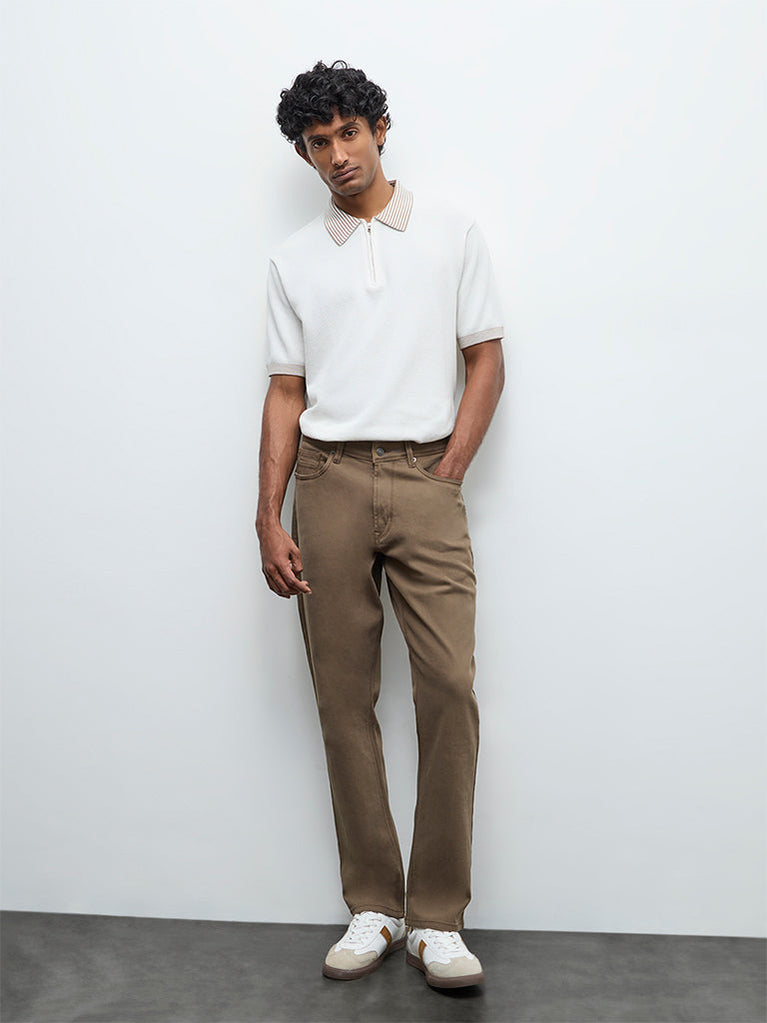 Ascot introduces these taupe jeans cut in a relaxed silhouette with a mid-rise waist for easy everyday wear. Designed with a buttoned closure, zipper fly, belt loops and a classic five-pocket layout, they balance function with a neat finish. Crafted from a breathable fabric, they deliver lasting comfort suited to regular rotation.