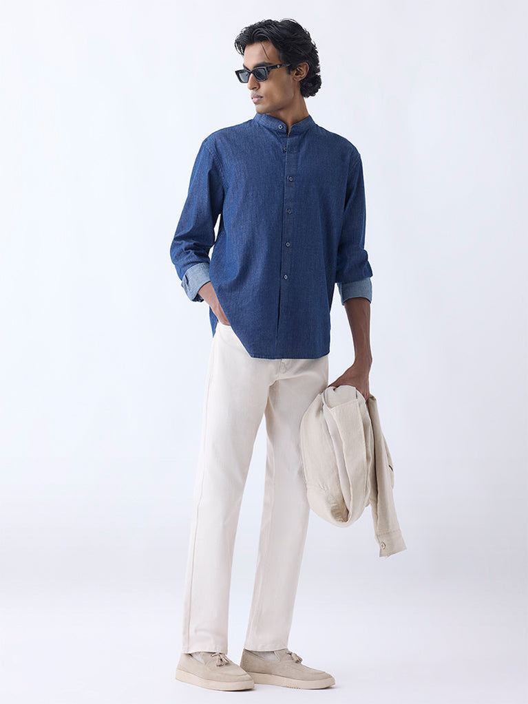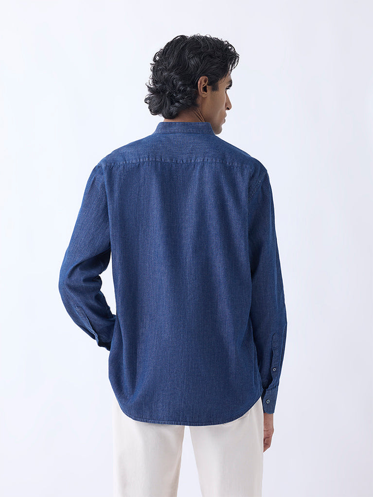 Defined by effortless sophistication, this blue denim shirt from Ascot is tailored with a stand-up collar, button-up front, and full sleeves. Woven from a lightweight fabric, its relaxed structure ensures day-long comfort while maintaining a poised silhouette.
