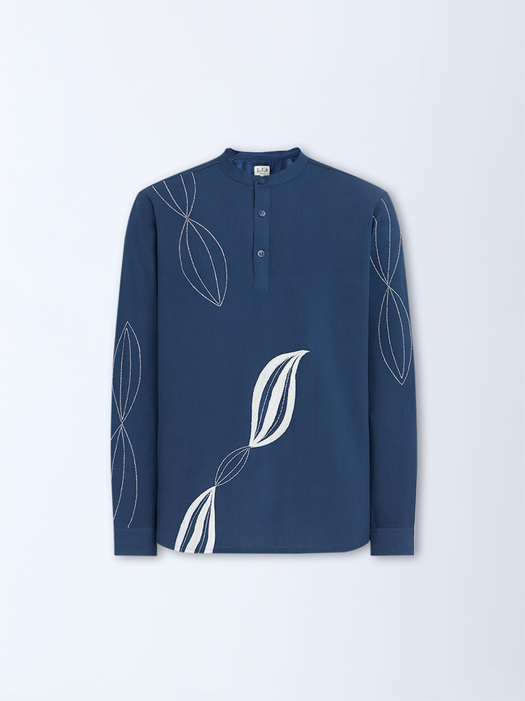 Make every outing effortlessly stylish with this indigo shirt from ETA. Showcasing abstract embroidery on a relaxed silhouette, it blends contemporary design with casual ease. Structured with a mandarin collar, button placket, and full sleeves, the cotton-rich garment ensures utmost comfort from AM to PM.