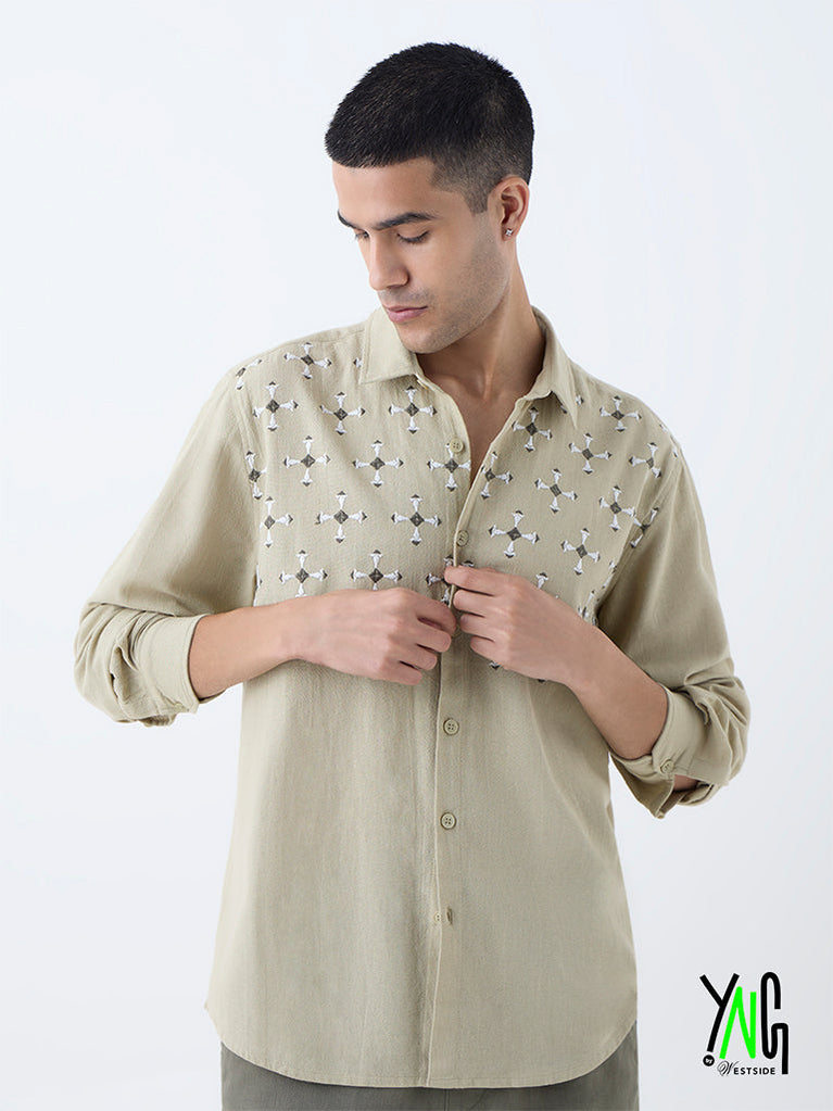 Refine your off-duty style with this beige shirt from ETA. Crafted from a cotton-rich fabric for daily comfort, it boasts intricate embroidery on a relaxed silhouette for a contemporary edge. Styled with a spread collar, button-up front, and full sleeves, this versatile piece effortlessly balances casual ease with subtle sophistication.