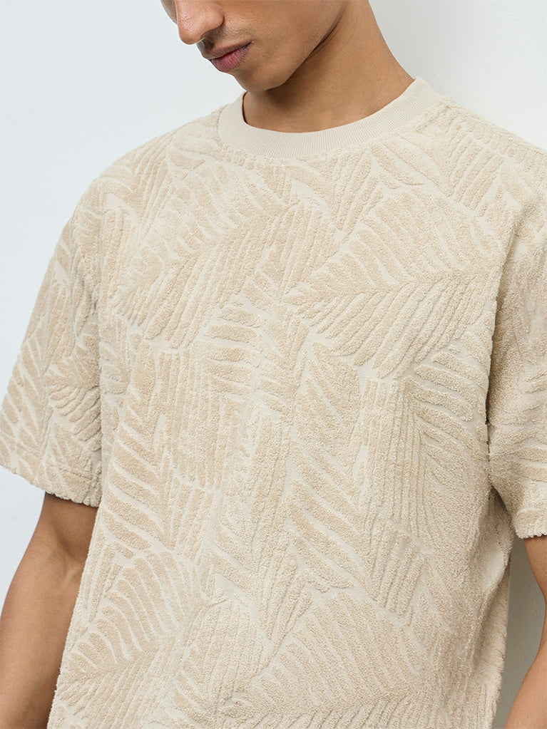 Ascot Beige Self-Stripe Relaxed-Fit Cotton-Blend T-Shirt