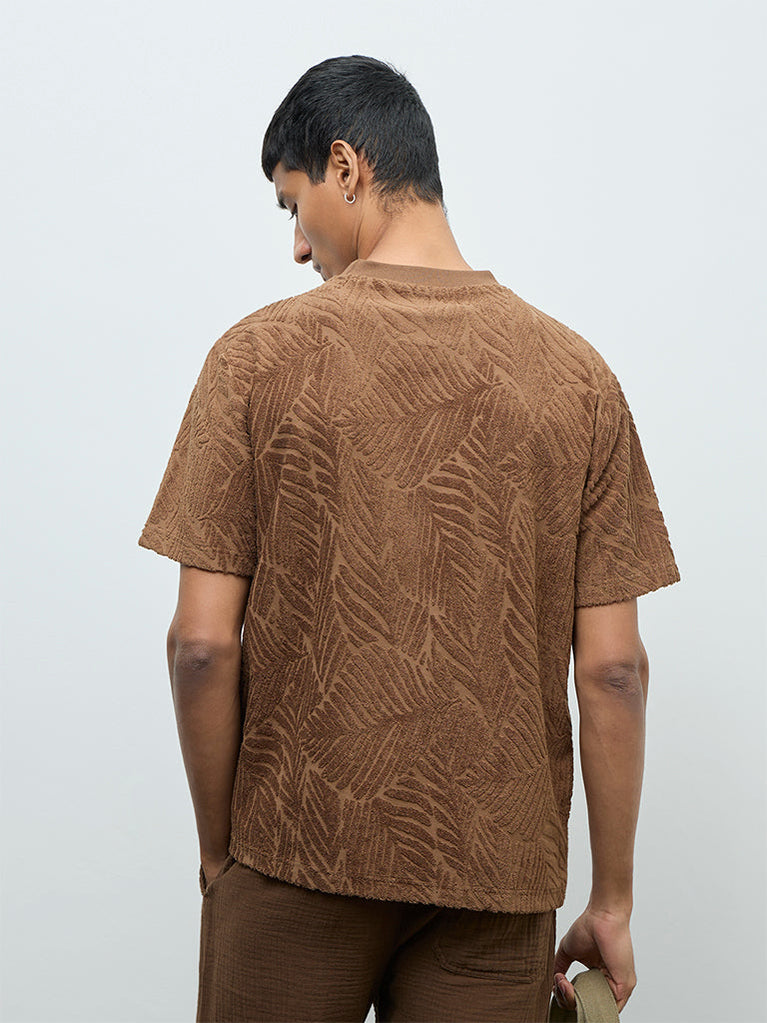 Bringing subtle detail to everyday dressing, this brown t-shirt from ETA is crafted from a soft cotton-blend fabric that feels light and breathable. The botanical textured pattern adds dimension to the relaxed silhouette. Finished with a crew neck and short sleeves, it works well for casual days and off-duty plans.