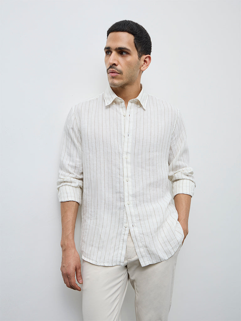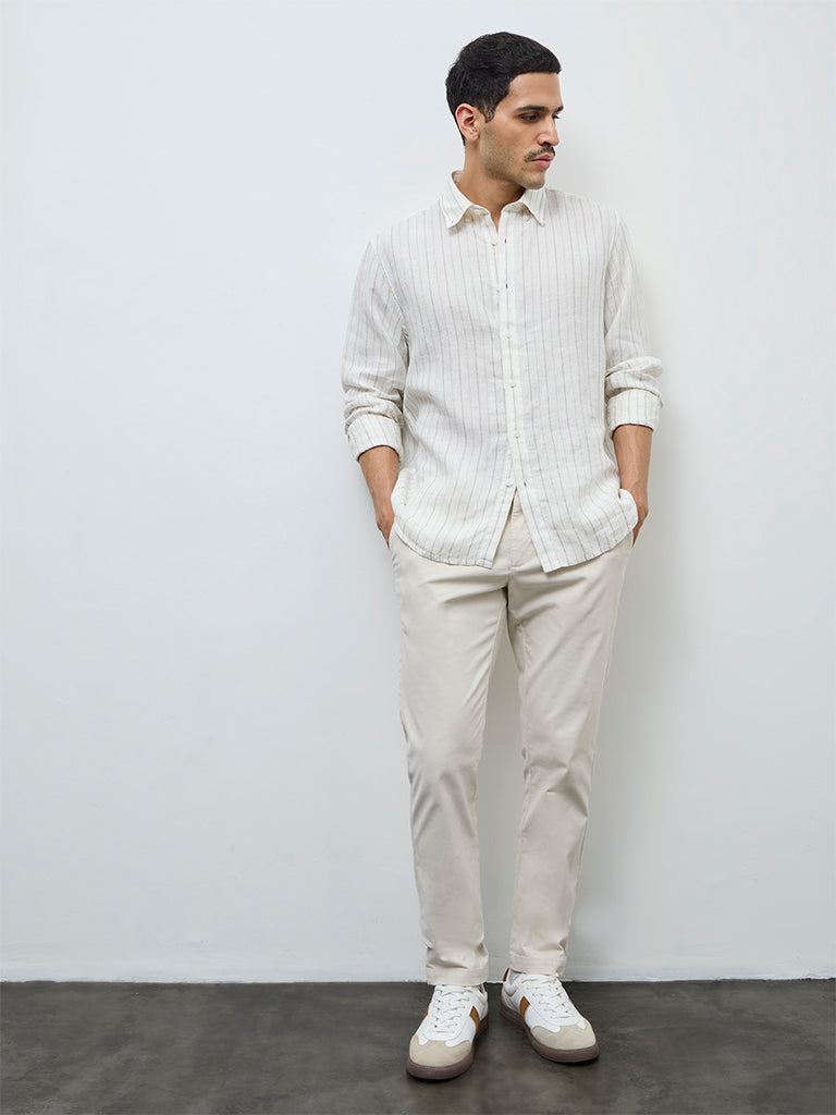 A refined summer essential, this off-white linen shirt from Ascot is detailed with classic stripes for a clean, elevated look. Cut in a relaxed handle, it features a crisp collar, full sleeves, and a button-up front. Lightweight and breathable, it’s designed for warm-weather dressing with effortless polish.