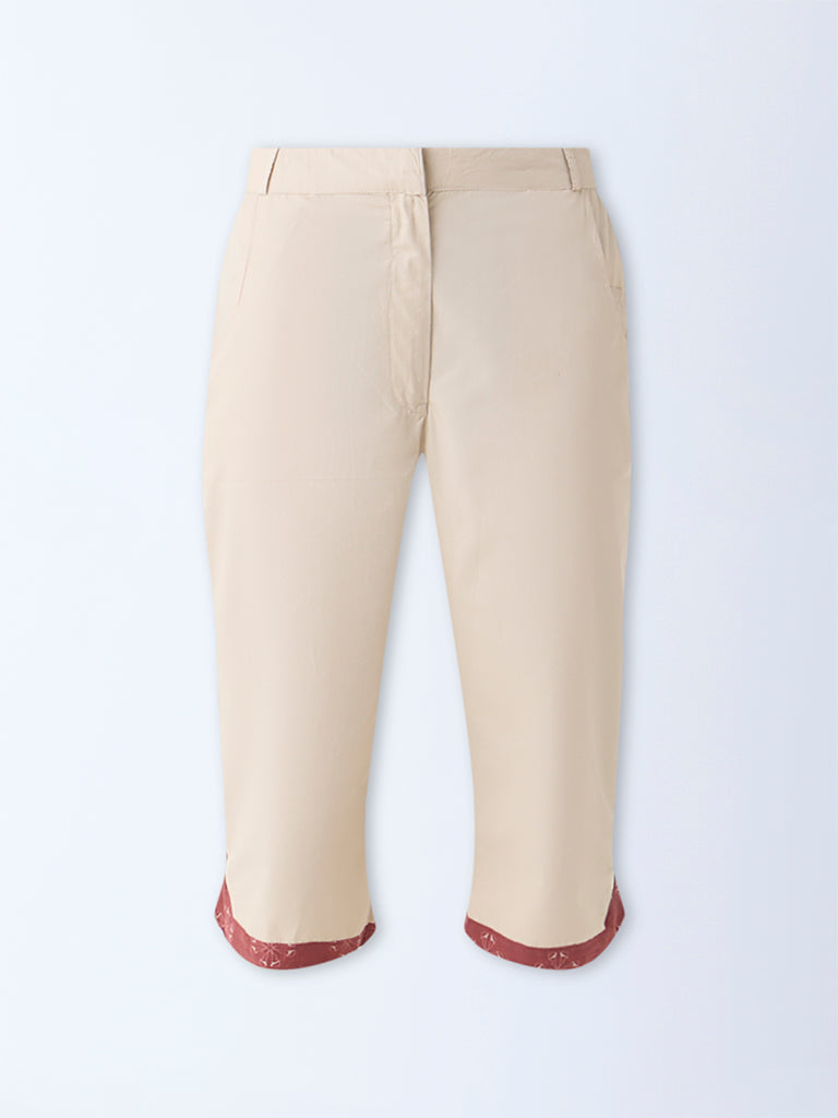 Reimagine casual elegance with these beige capris from Bombay Paisley. Crafted from pure cotton, they offer a tailored silhouette that flatters effortlessly. Equipped with a buttoned waistband, belt loops, zipper placket, and functional side pockets, they balance practicality with style.