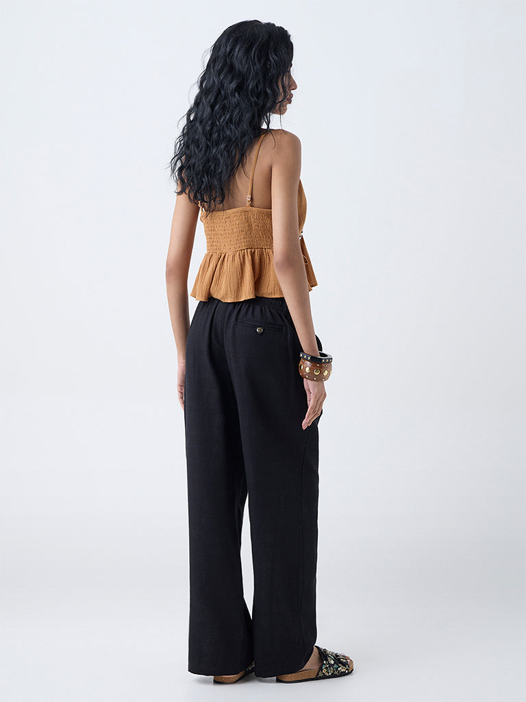 These black pants from Bombay Paisley offer a versatile base for both relaxed and refined looks. The cotton-blend fabric keeps them lightweight and easy to wear, while the buttoned waistband and drawstring tie strike a balance between structure and comfort. Finished with functional side pockets, they’re an effortless choice for everything from weekday errands to evening plans.