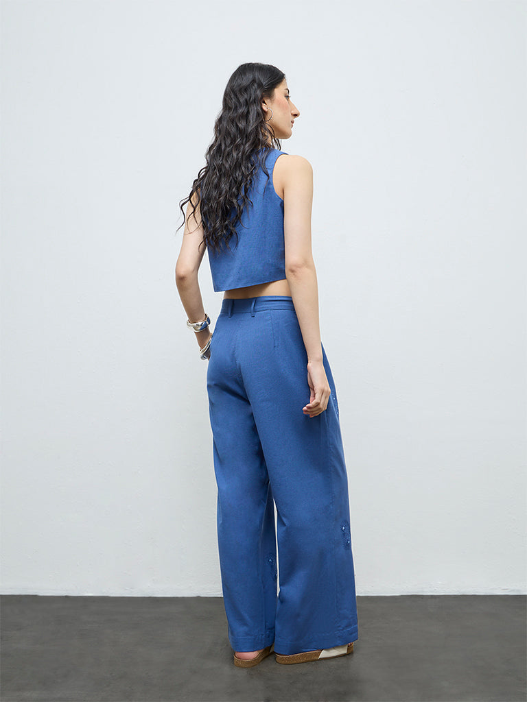 These blue palazzos from Bombay Paisley add a touch of detail to everyday looks with its paisley embroidered motifs. The high rise silhouette is balanced with a buttoned waist, a zipper placket and belt loops, while side pockets bring in everyday practicality. Crafted from a breathable cotton fabric, they are well suited for casual plans and relaxed styling.
